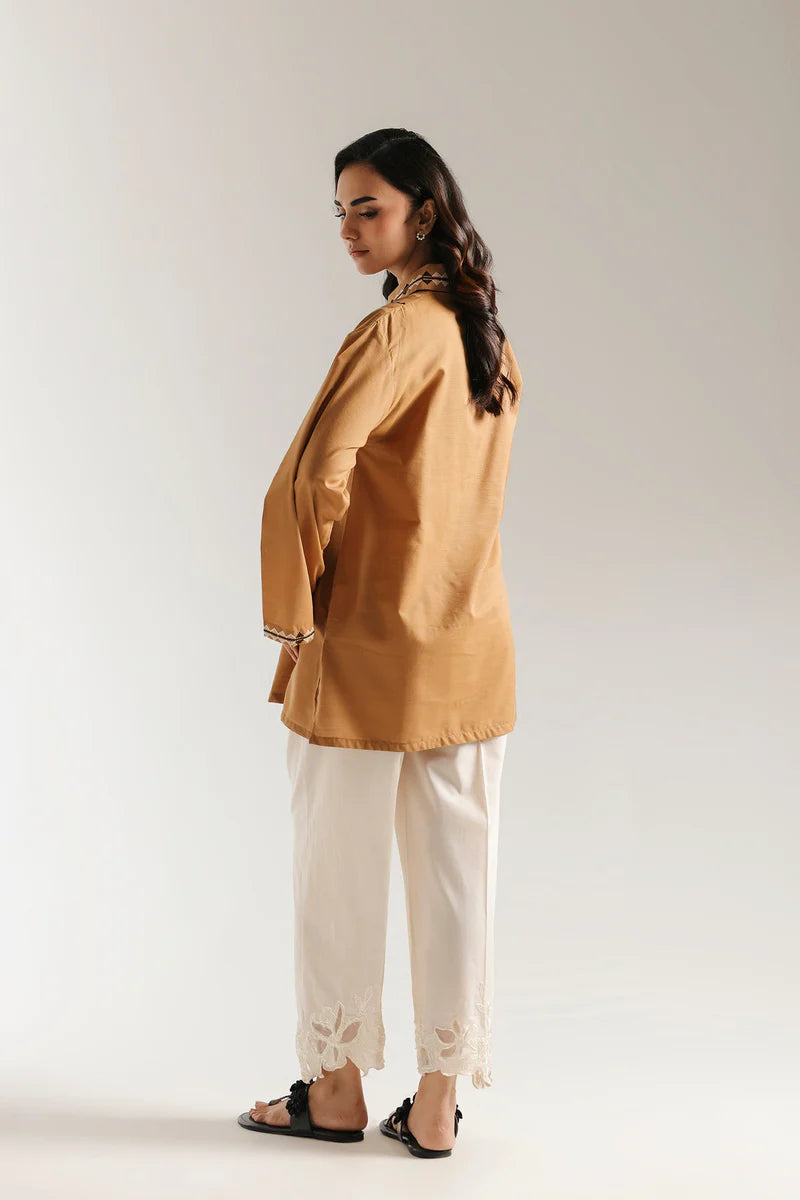 This sophisticated embroidered kurti is a true statement piece. The warm tan fabric is a canvas for striking black and beige geometric embroidery, creating a bold, artistic pattern. With its elegant silhouette and wide sleeves, this piece offers a modern and captivating look.