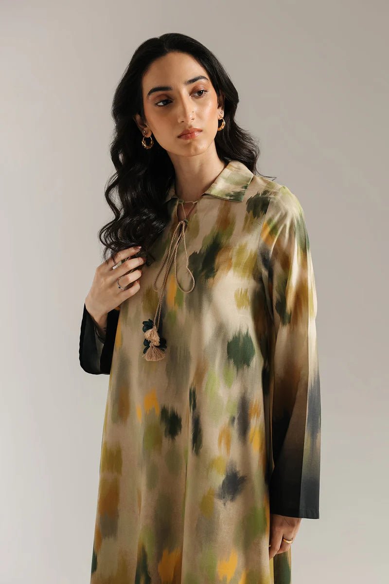 A masterpiece of abstract artistry. This stunning long dress features a beautiful print in a captivating blend of earthy tones, including beige, brown, and hints of green and yellow. The unique, flowing silhouette is complemented by contrasting black cuffs at the sleeves and tassels at the neckline. This ensemble is a celebration of modern design and bohemian elegance.