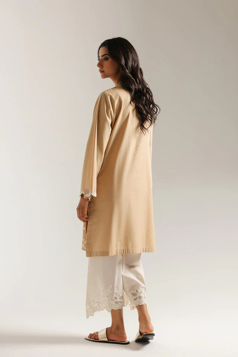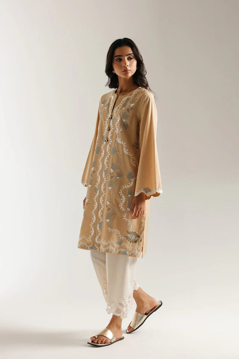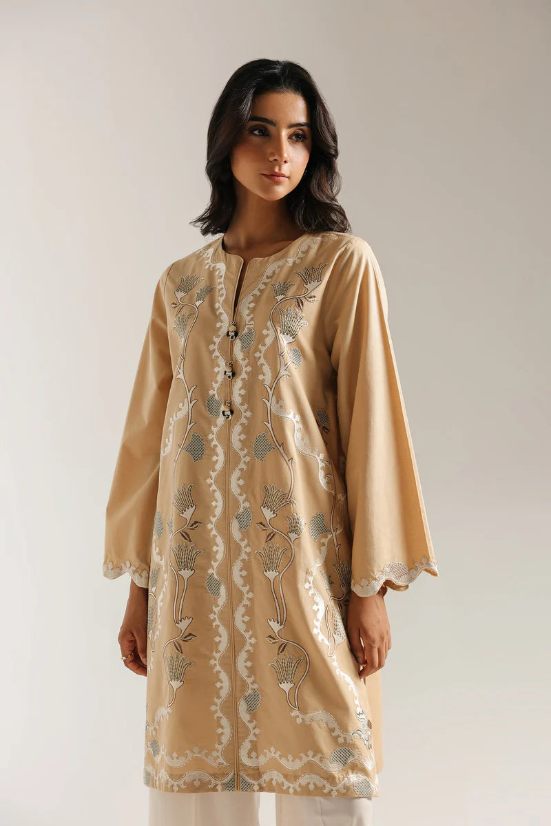 Adorn yourself in timeless elegance with this exquisite embroidered shirt. Crafted from rich, cotton viscose fabric in a beautiful, warm hue, this shirt is a perfect blend of comfort and style. Delicate embroidery with intricate floral patterns in silver-gray and off-white adorns the front, creating a stunning visual contrast. The classic round neckline and full-length sleeves with subtle bell-shaped cuffs add a touch of grace to the silhouette. Perfect for both casual outings and special occasions, it's a testament to refined craftsmanship and understated beauty.