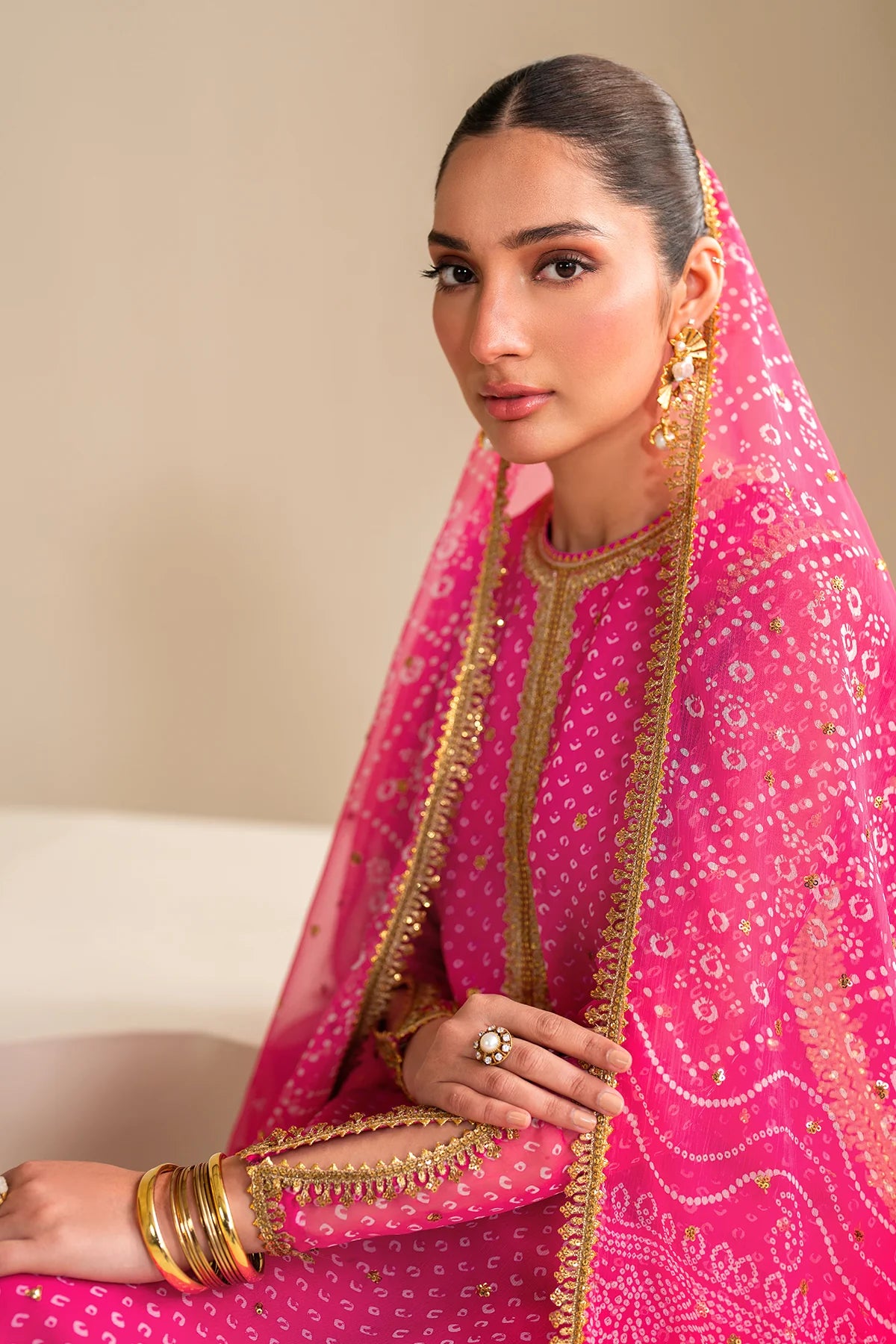 Crafted from pink digital printed chiffon, this shirt dazzles with its intricate embroidery on both the front and back necklines. The sleeves and body shimmer with sequins, creating a stunning visual effect with chunari design.