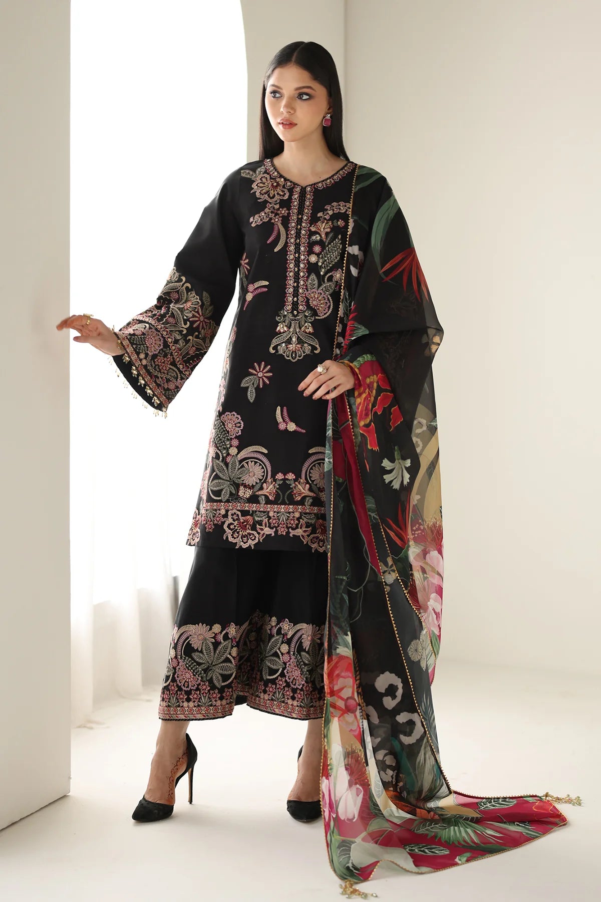 Elevate your wardrobe with this stunning embroidered raw silk ensemble. Every piece showcases meticulous craftsmanship—from the intricately embroidered front and back panels to the beautifully detailed sleeves and coordinating borders. The matching embroidered raw silk trousers complete the sophisticated look, while the digital printed silk dupatta adds a modern finishing touch. Perfect for special occasions, this collection celebrates traditional artistry with refined elegance. Experience the luxurious feel of premium raw silk combined with expert embroidery work that speaks to quality and timeless style.