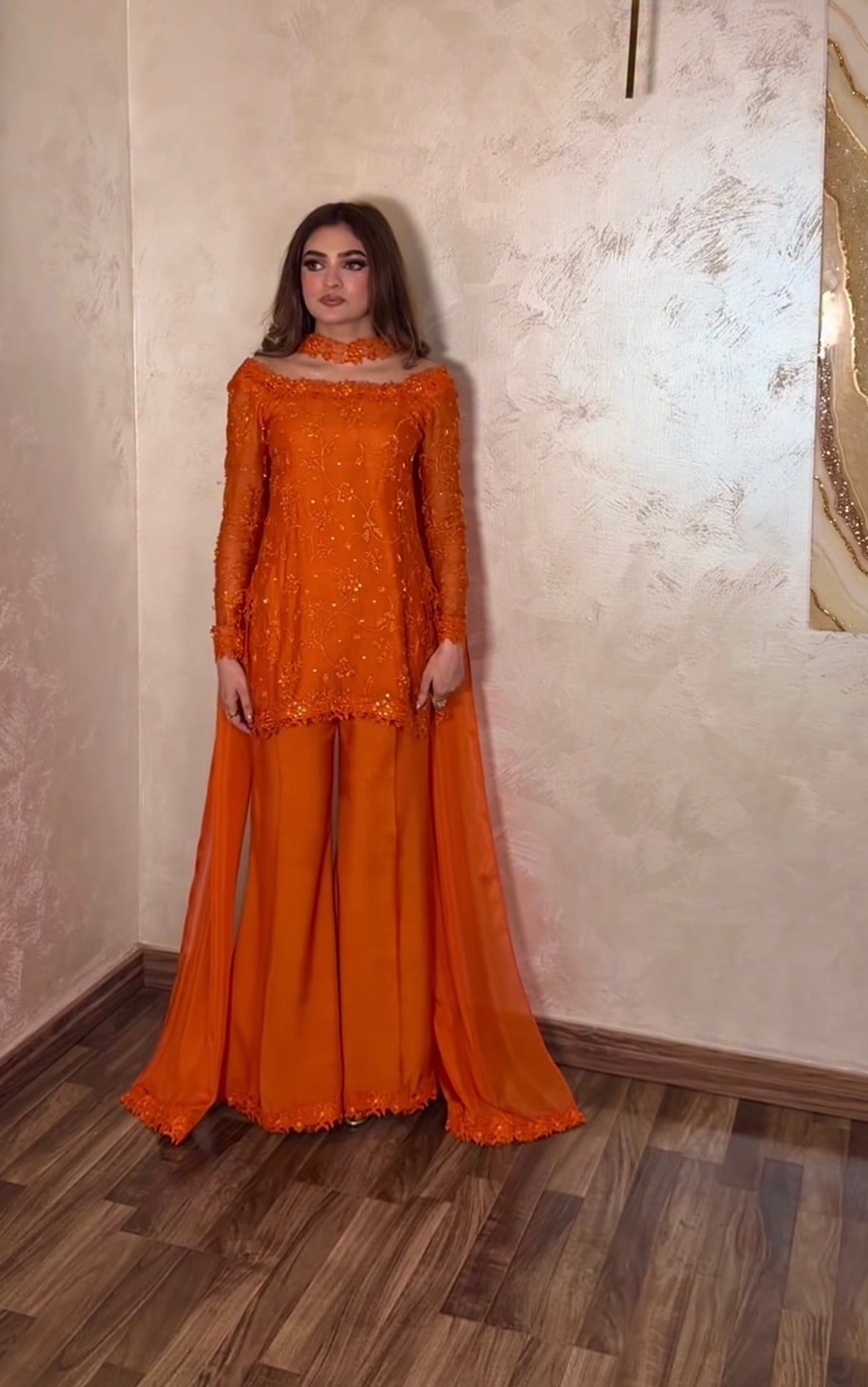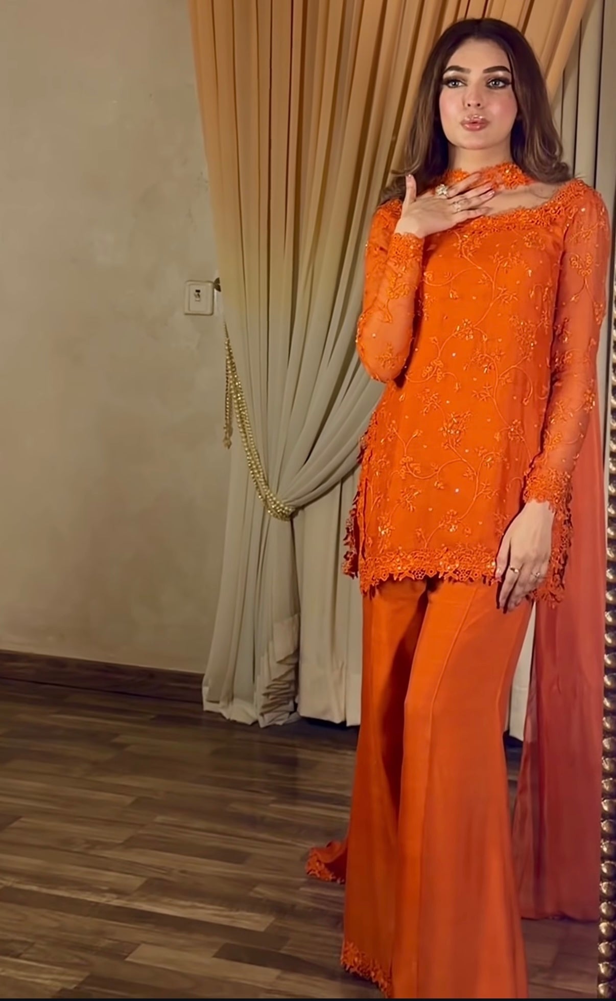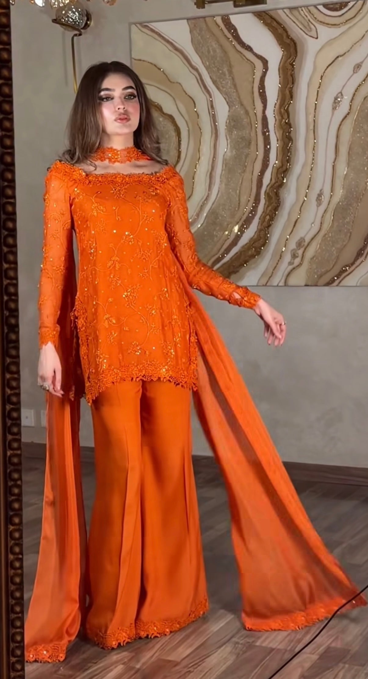A vibrant orange hue that captures the essence of summer perfectly. Crafted from pure cotton net, this piece features intricate hand embroidery and detailed handwork, making it a true statement ensemble. It is paired with raw silk bootcut pants and a medium silk dupatta, delicately hand embellished to complete the look.