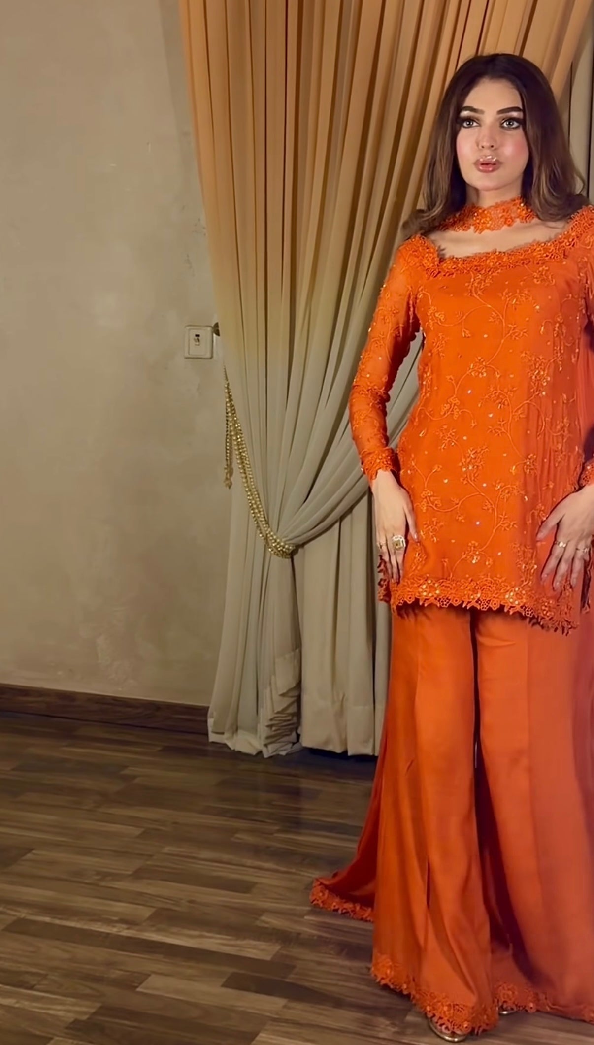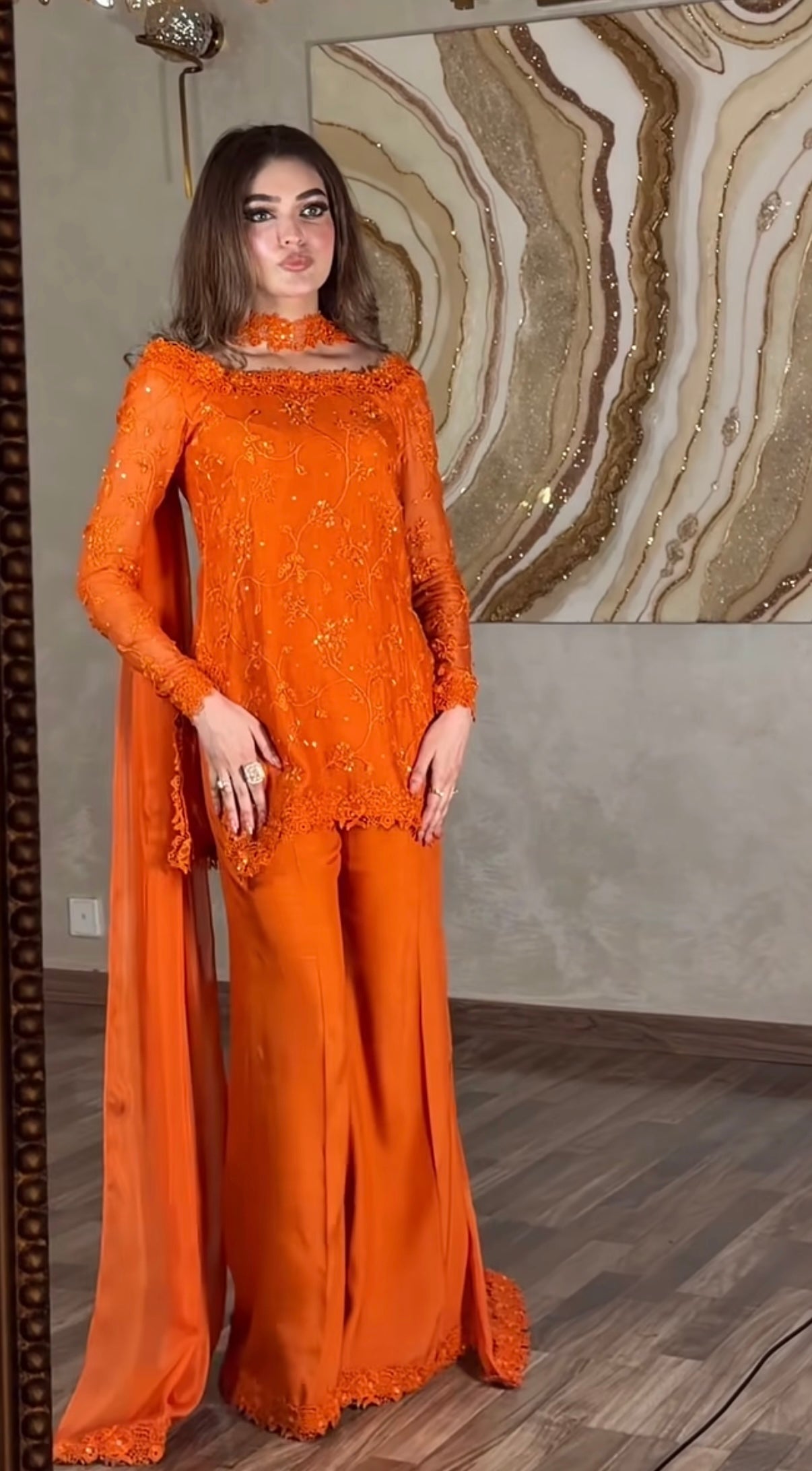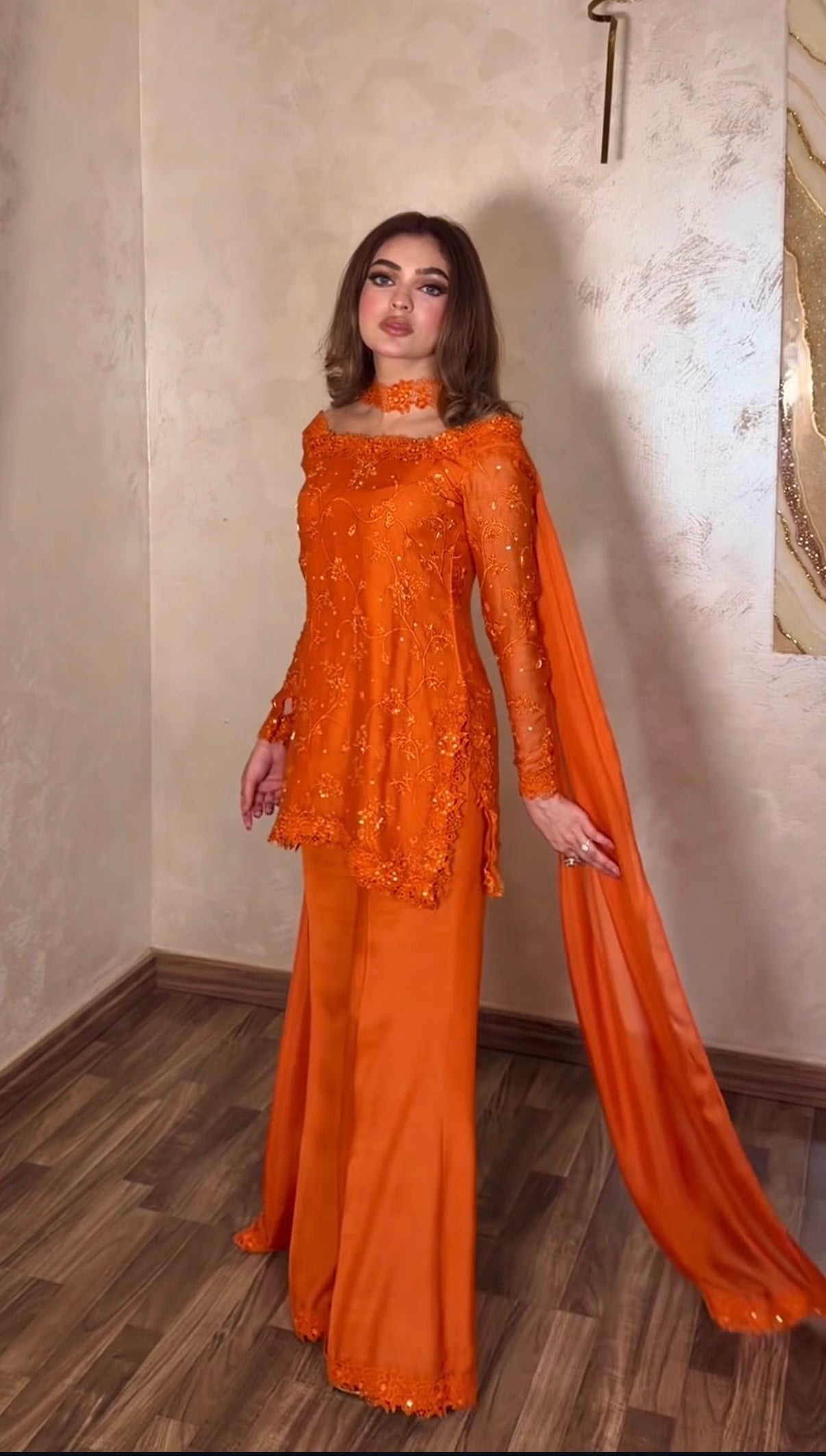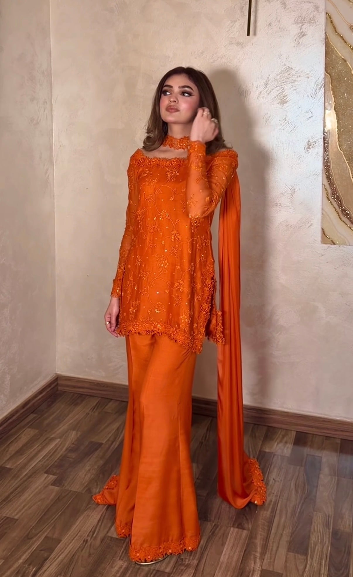 A vibrant orange hue that captures the essence of summer perfectly. Crafted from pure cotton net, this piece features intricate hand embroidery and detailed handwork, making it a true statement ensemble. It is paired with raw silk bootcut pants and a medium silk dupatta, delicately hand embellished to complete the look.