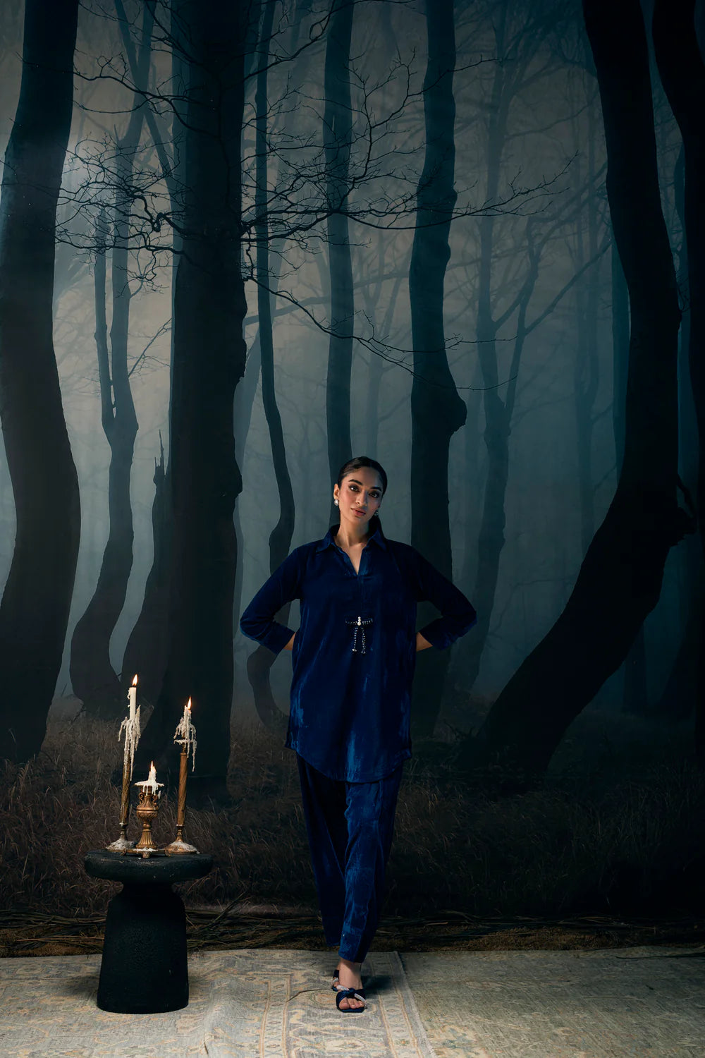 A deep royal blue velvet kurta with a clean collar and a soft front fall, finished with tassel detailing on the neckline. The relaxed silhouette pairs with straight velvet trousers, creating a look that feels polished, modern, and quietly striking.