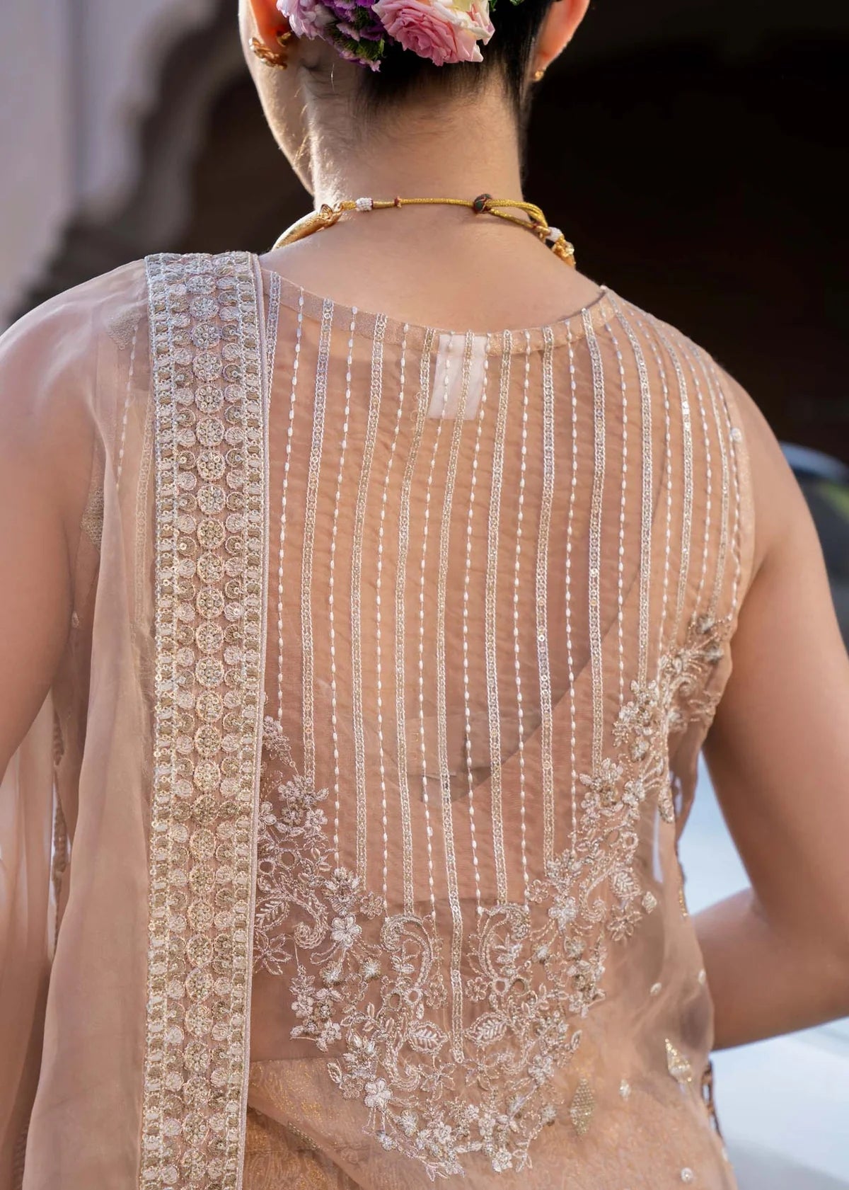 Selene exudes charm with its front-open shirt in soft tone organza, adorned with delicate tassel details and intricate sequence work. Paired seamlessly with jamawar sharara pants and a organza dupatta featuring rich heavy borders, this ensemble epitomizes elegance and allure