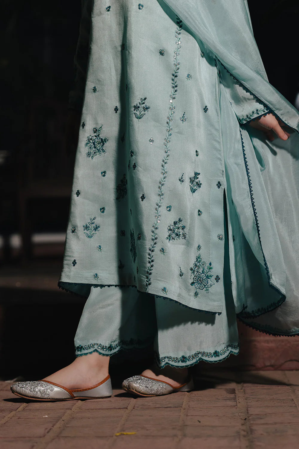 A sky blue shirt adorned with intricate embroidery, paired with loose-fit pants featuring delicate lacework and a beautifully embroidered silk dupatta.