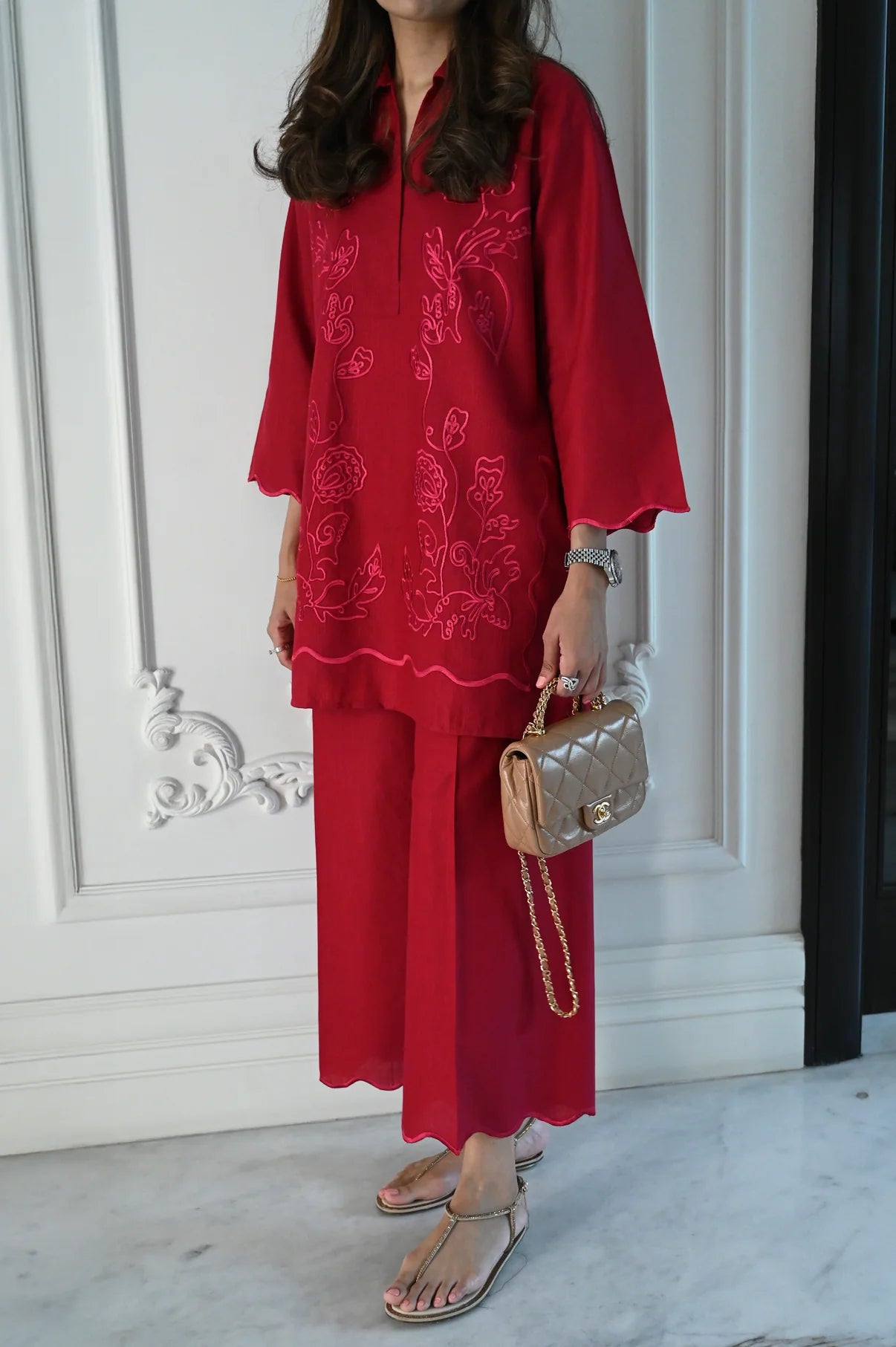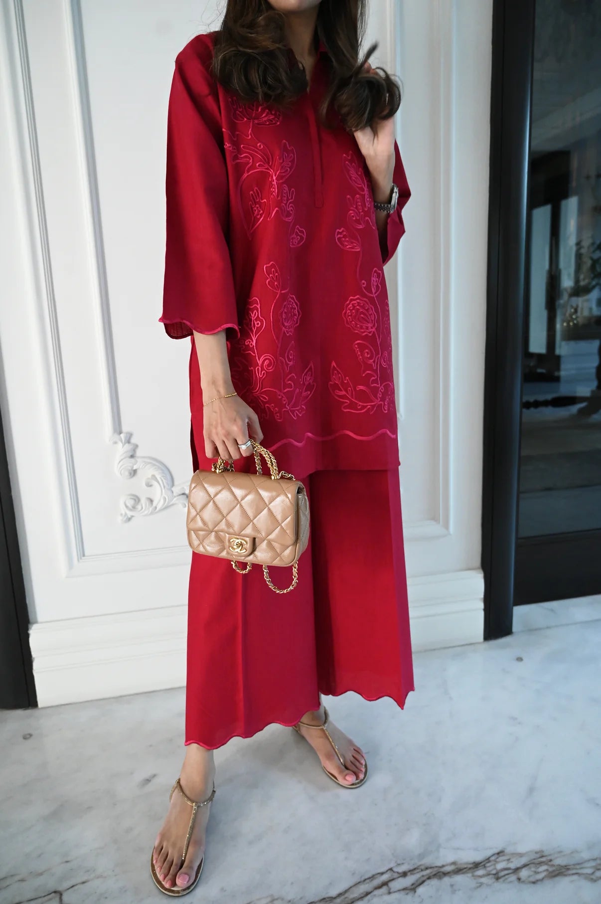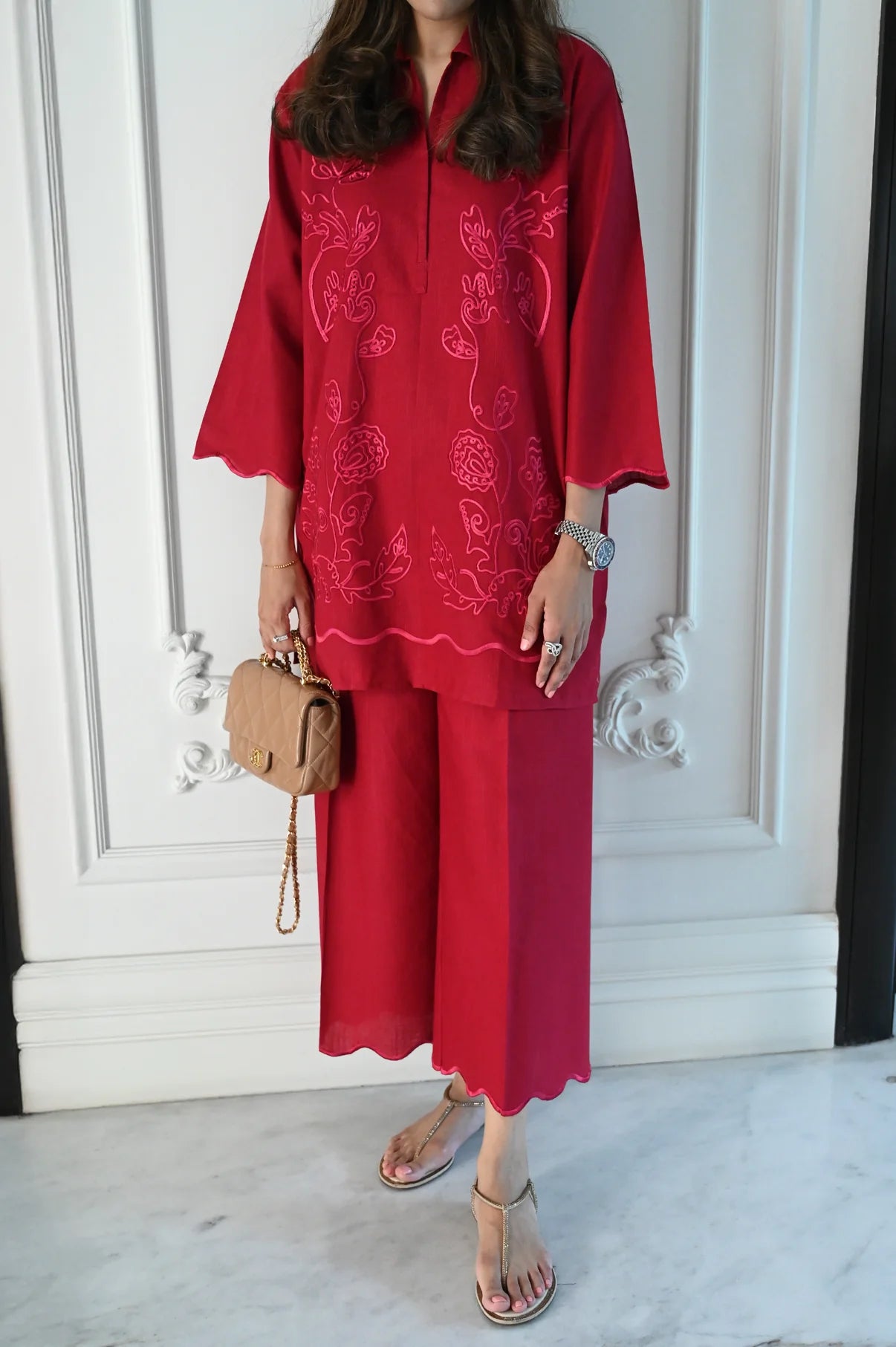 A chic two-piece co-ord in a rich crimson rose shade, featuring a relaxed kurta adorned with tonal pink thread embroidery inspired by botanical motifs. The kurta is styled with a soft collared neckline and wide sleeves, paired with matching culottes finished with a subtle scalloped hem.