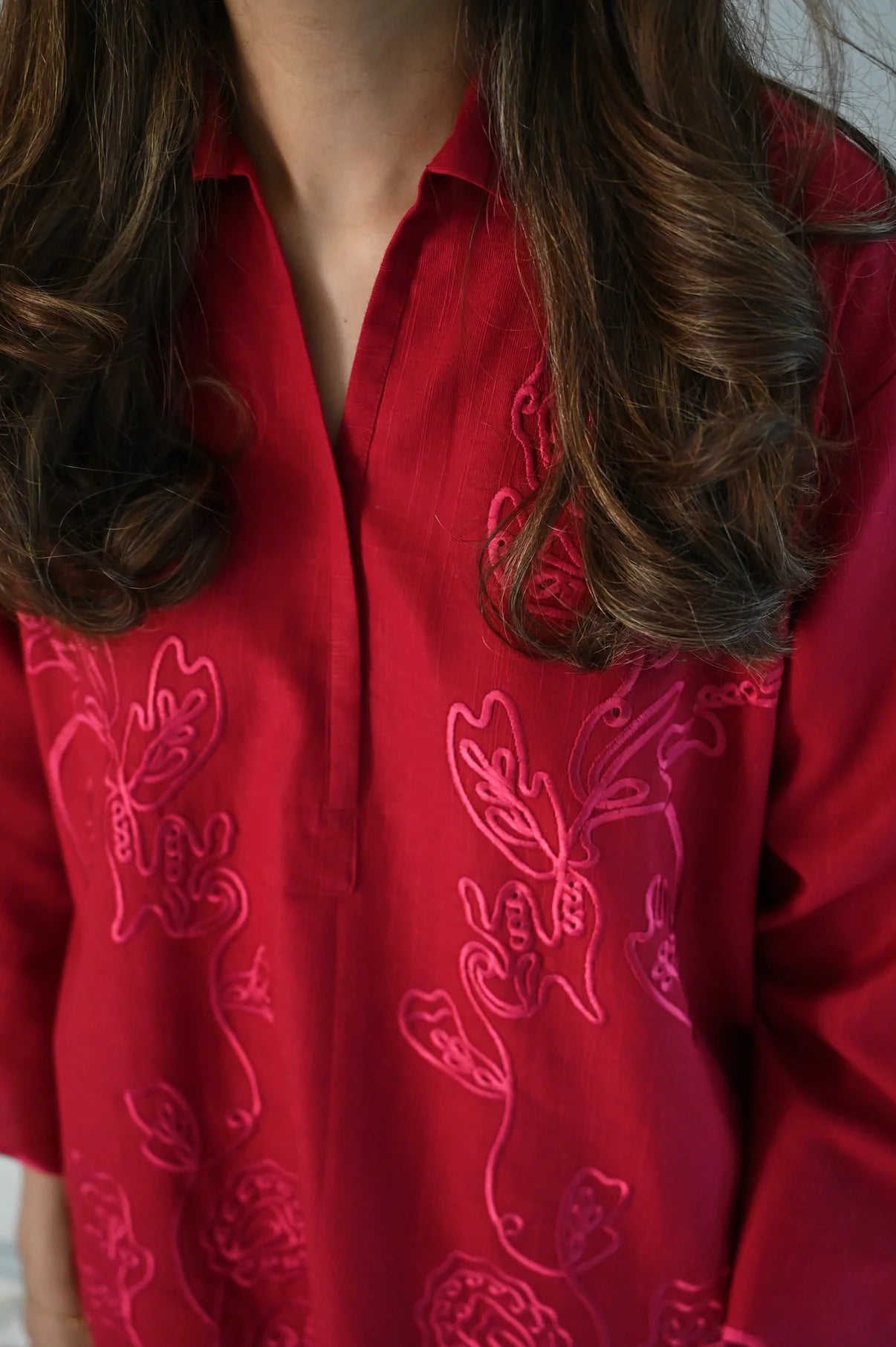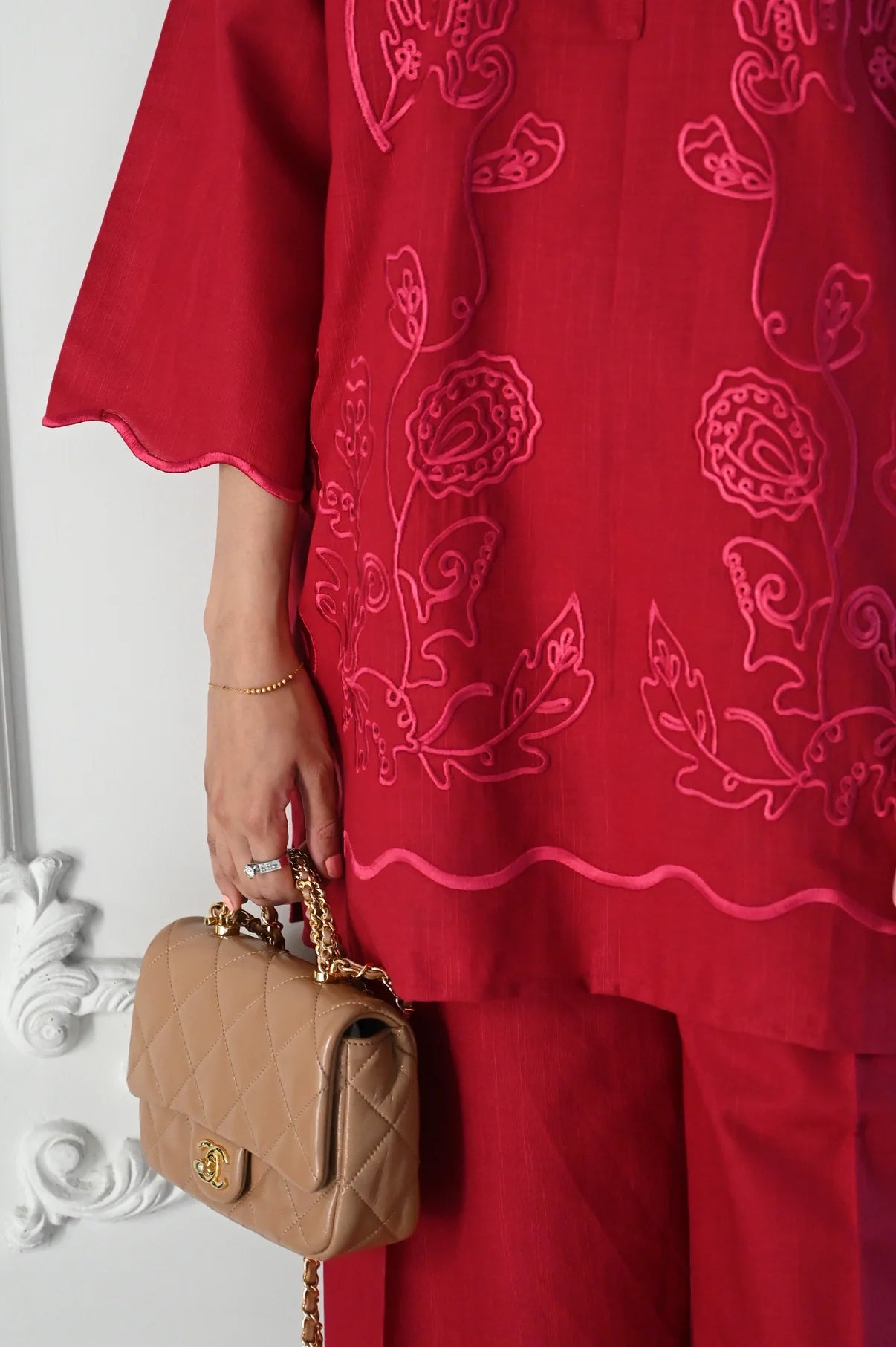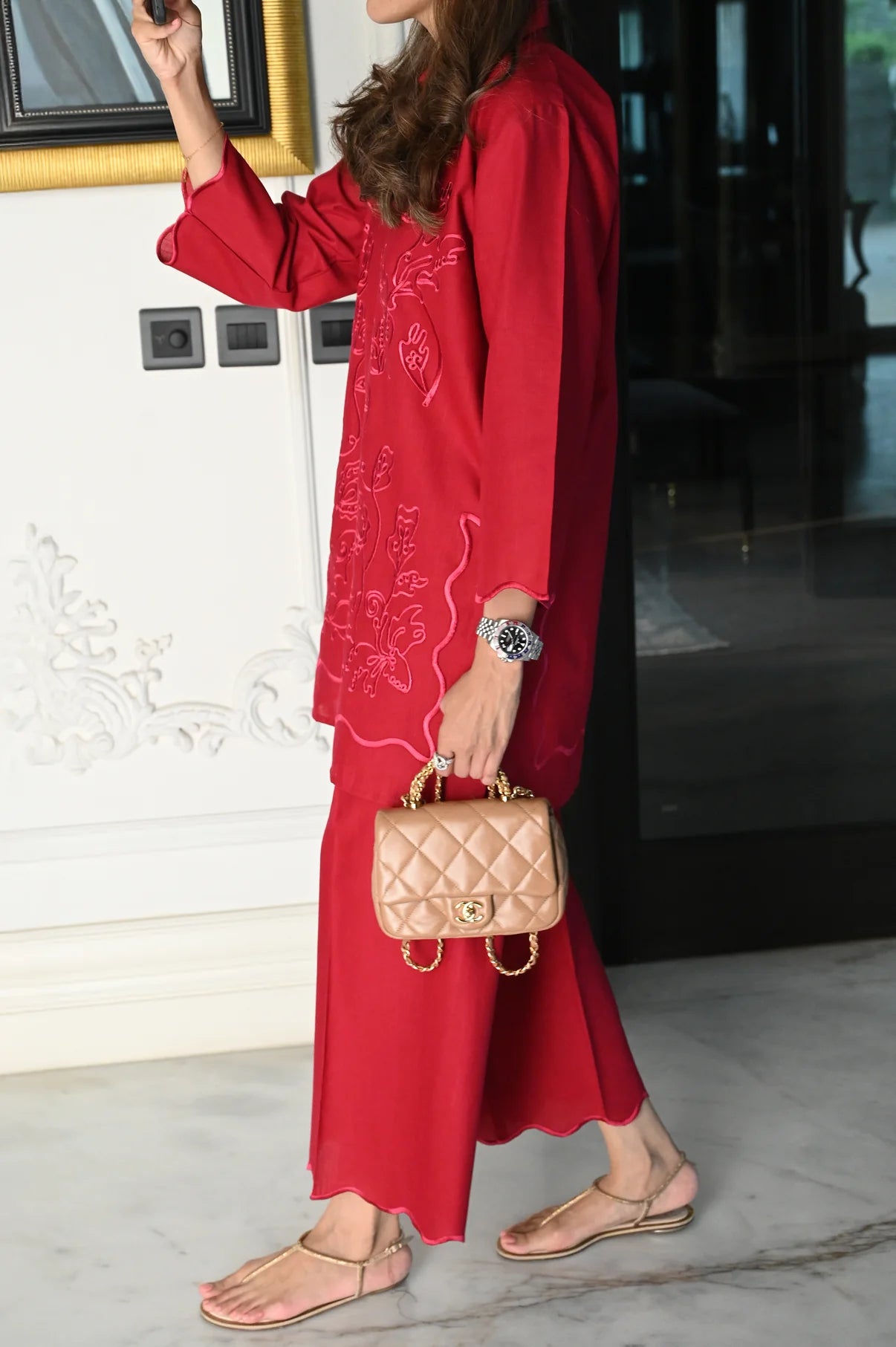 A chic two-piece co-ord in a rich crimson rose shade, featuring a relaxed kurta adorned with tonal pink thread embroidery inspired by botanical motifs. The kurta is styled with a soft collared neckline and wide sleeves, paired with matching culottes finished with a subtle scalloped hem.