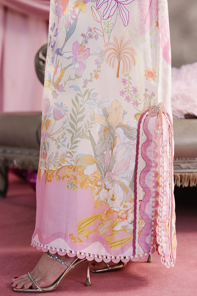 A graceful tea pink and beige printed kaftan, designed to flow effortlessly with an air of understated elegance. The neckline is delicately embellished with Swarovski stones, highlighted by intricate cutwork circles and heart motifs that add a playful yet sophisticated charm. Thoughtfully placed pearl accents and beaded bow tassels eleveate silhouette with subtle sparkle
