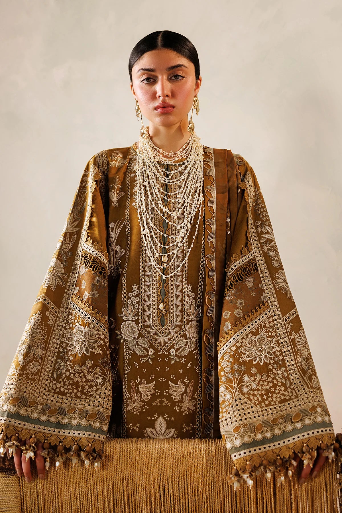This premium unstitched lawn suit features an exquisite ensemble of intricately embroidered components. The collection includes a beautifully embroidered self-jacquard lawn front panel paired with matching side panels and sleeves, complemented by a plain jacquard back. Ornate organza borders adorn the front, back, and neckline, while coordinating sleeve borders add refined detailing. The set features two coordinating dupattas—a digitally printed lawn option and an embroidered chiffon piece—both trimmed with embellished organza borders and decorative motifs. A dyed cotton trouser completes the ensemble. This comprehensive unstitched collection offers the flexibility to customize your fit while showcasing sophisticated embroidery work and premium fabric quality.