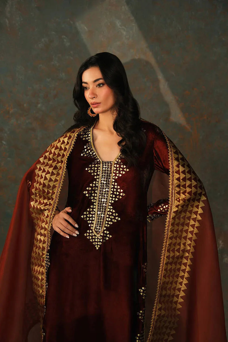 Crafted in deep burnt-garnet velvet, this silhouette is adorned with geometric gota handwork that catches the light like glowing embers at dusk. Paired with a firey block print organza dupata the look blends tradition and modern finesse. Comes with wide legged Korean silk pants.
