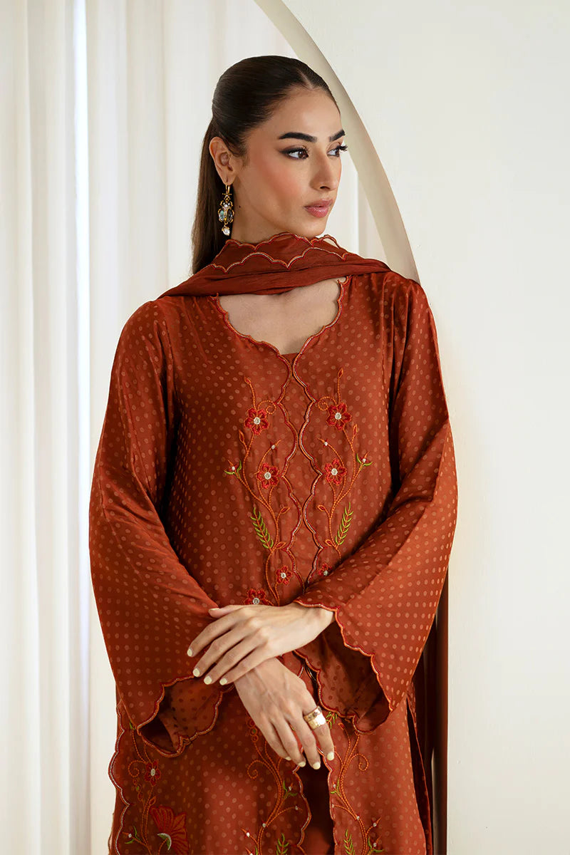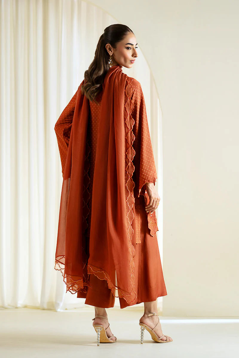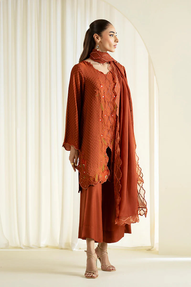 This set is the kind of outfit that makes you feel instantly put together without even trying. The textured long shirt features delicate embroidery and a chic front slit, paired with flowy wide-legged trousers and a soft sheer dupatta — perfect for festive dinners.