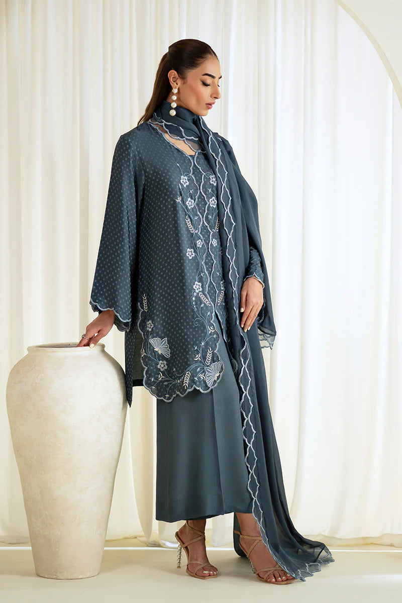 An outfit that feels effortlessly chic: the embroidered textured long shirt with its modern front slit, paired with wide trousers and a soft sheer dupatta — perfect for those special festive gatherings.
