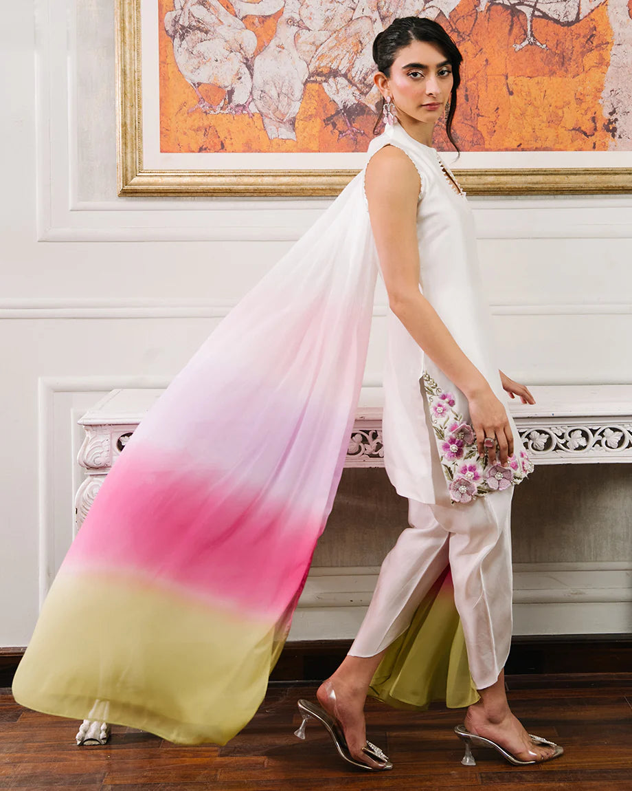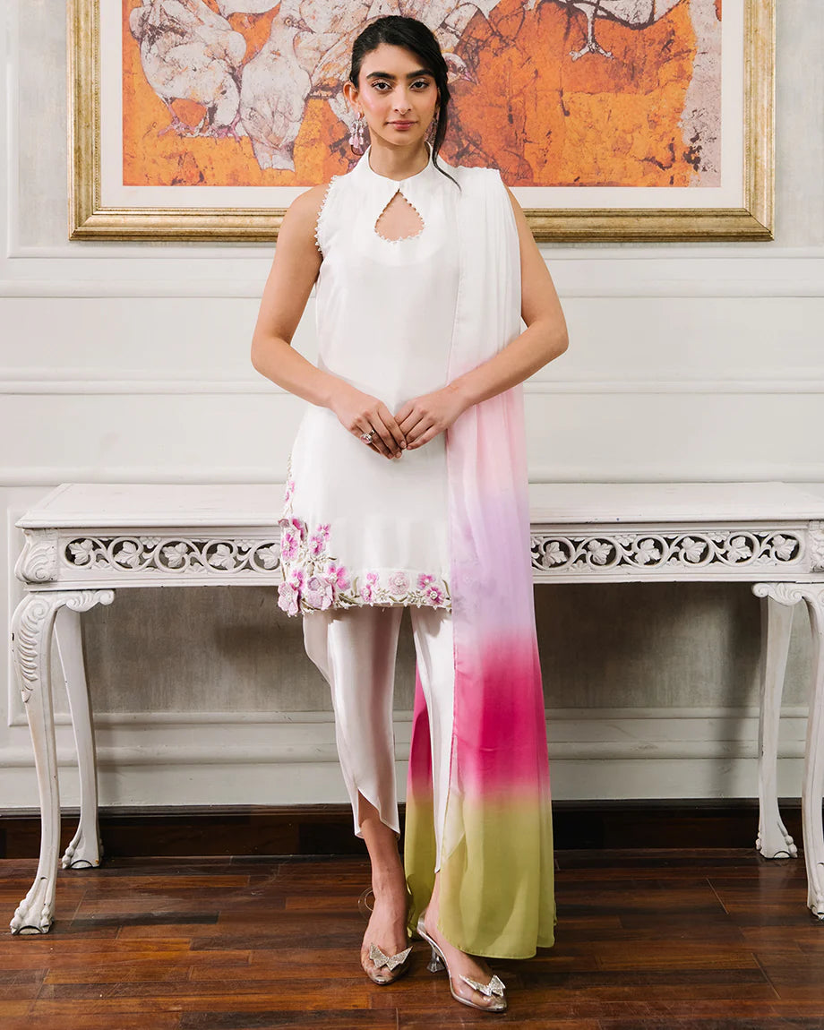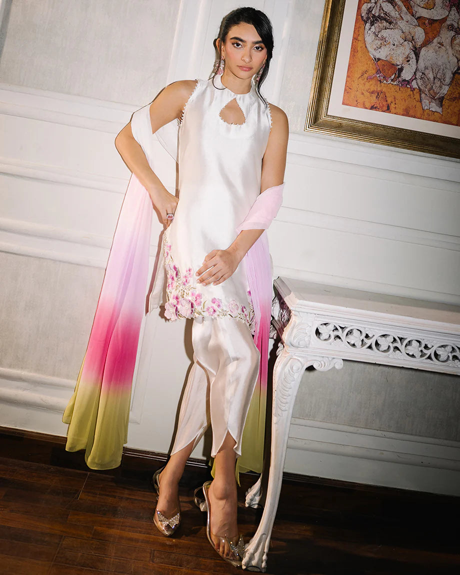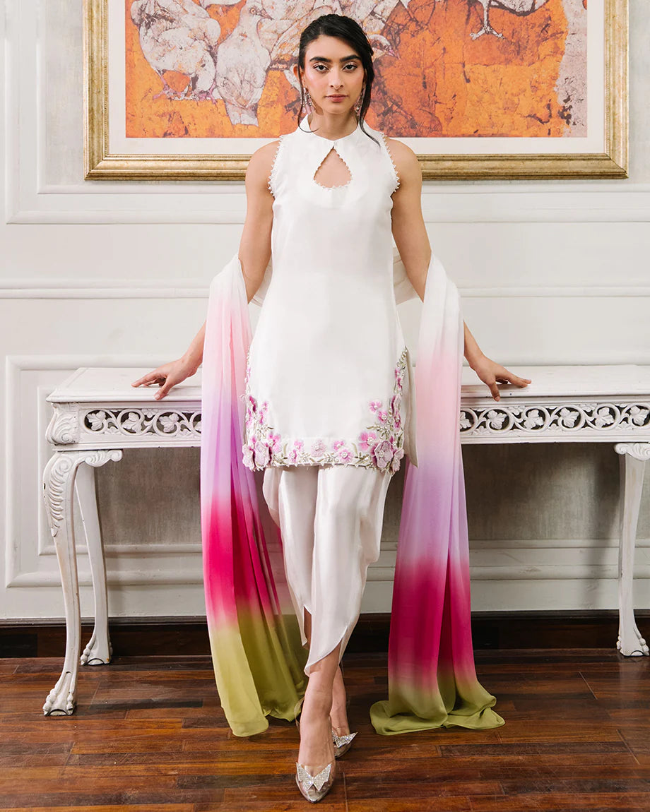 A pure white 3-piece set featuring a sheesha silk shirt and tulip shalwar with inner lining, paired with a soft silk tie-dye dupatta. Accented with 3D resham and resham work on the daaman and sleeves, crafted for a refined and graceful look.