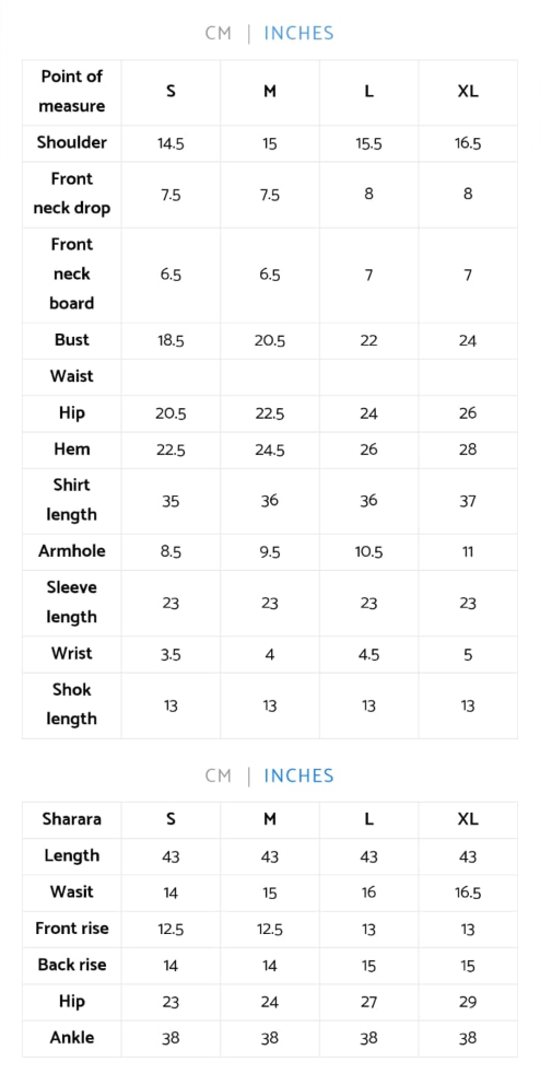This vibrant teal short shirt is a stylish choice, paired beautifully with a printed sharara. Complete the look with a delicate organza dupatta for an elegant touch. Perfect for casual outings or festive occasions!