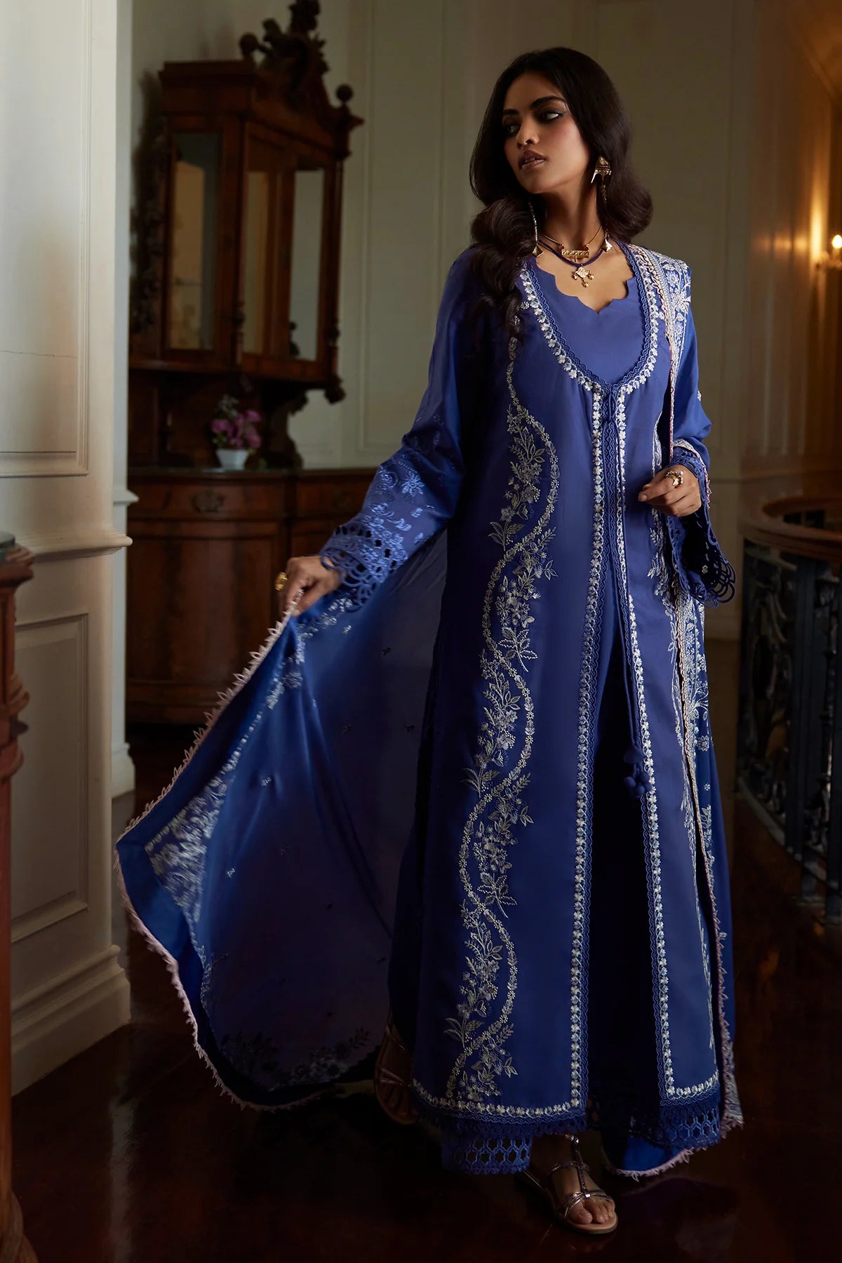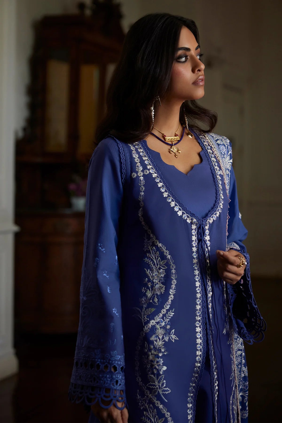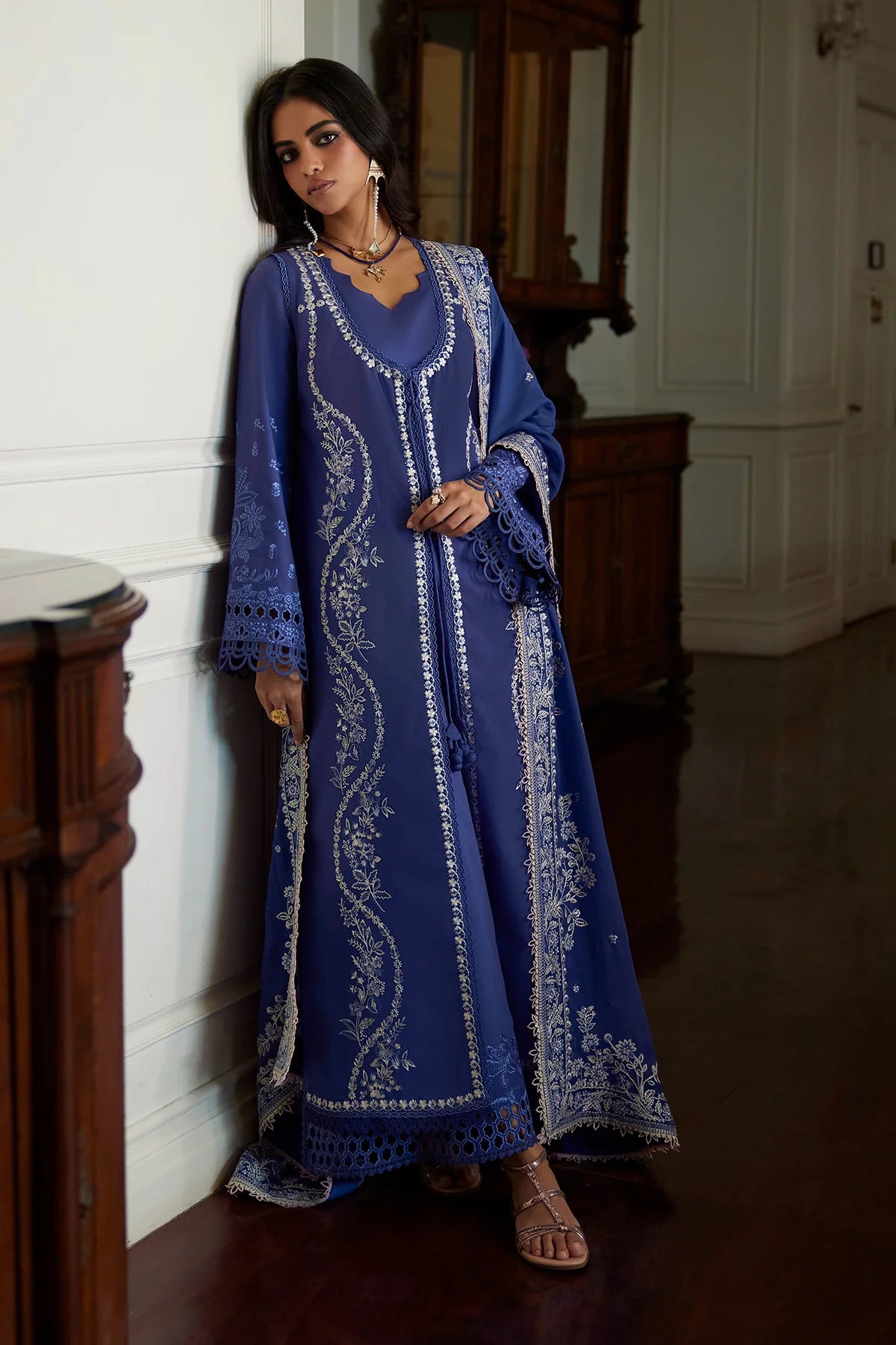 Introducing our stunning deep periwinkle dress, designed with a front-open style shirt that exudes elegance. The dress features an inner shirt adorned with beautiful embroidery and intricate cutwork details, complemented by delicate lace accents. Paired with an embroidered chiffon dupatta and stylish culottes pants, this outfit is perfect for any special occasion. Embrace a blend of sophistication and modern fashion with this exquisite ensemble!