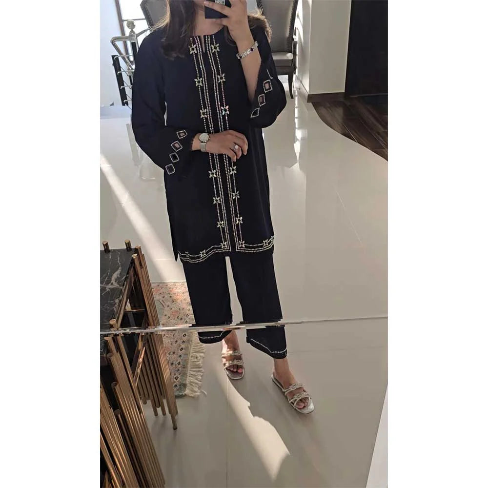 Elevate your style with our sophisticated navy blue ensemble featuring intricate swarovski and emerald green crystals handwork all over.