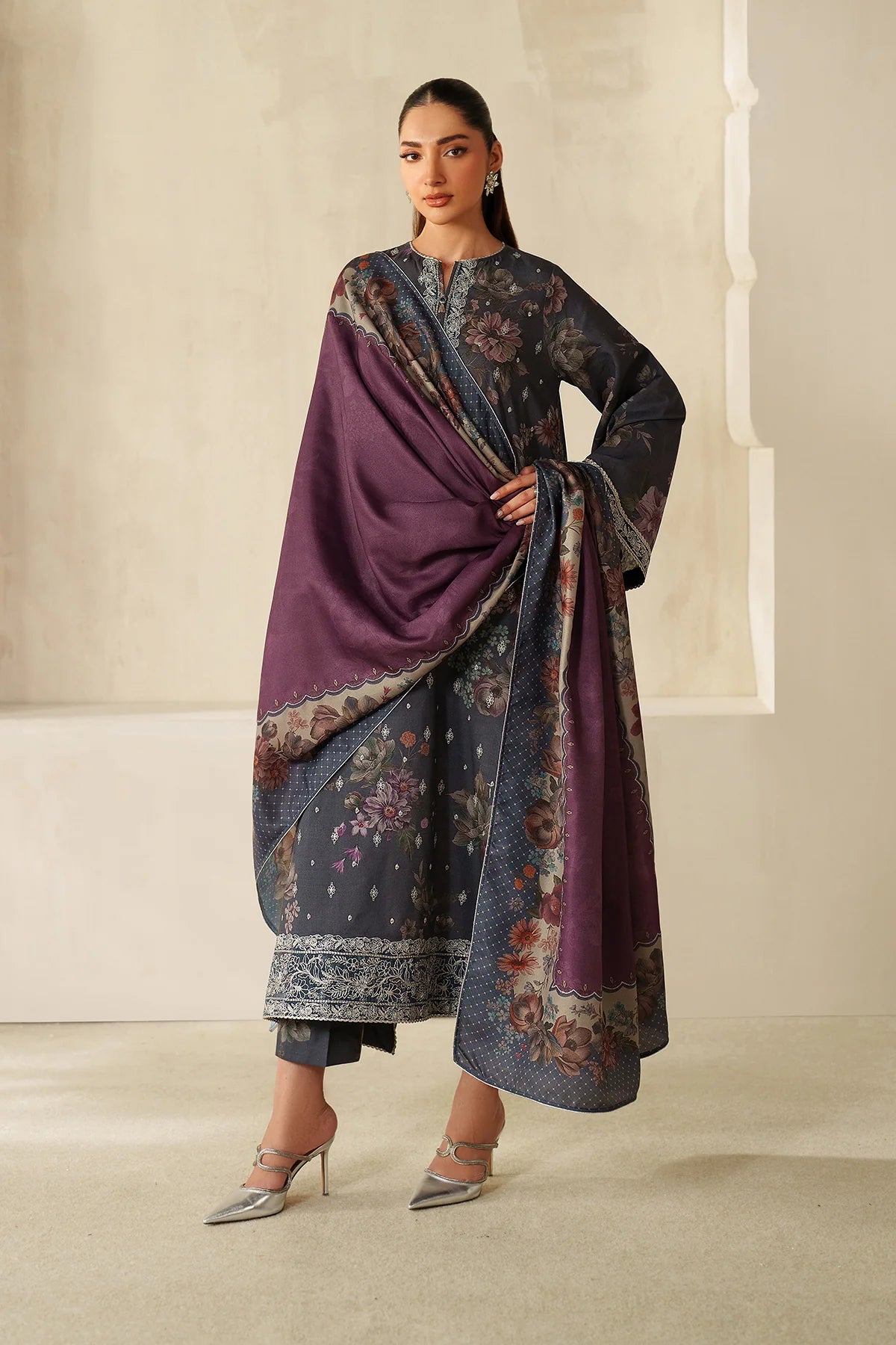Elevate your wardrobe with this stunning embroidered khaddar ensemble. The front features intricate embroidery on premium slub khaddar, while the back, sleeves, and trousers showcase beautiful digital prints. Delicate embroidered organza details grace the neckline patch, front borders, and sleeve edges, adding refined elegance. Complete your look with the coordinating digital printed pashmina shawl. Perfect for special occasions or everyday sophistication, this three-piece set combines traditional craftsmanship with contemporary design for a truly memorable appearance.