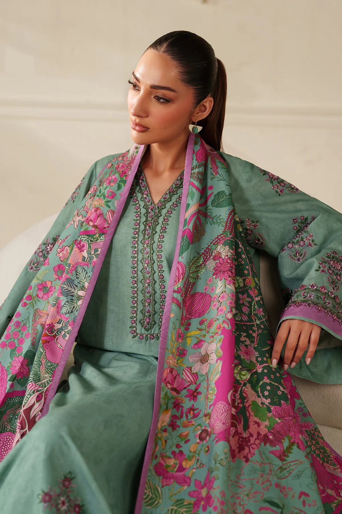 Elevate your wardrobe with this stunning three-piece ensemble featuring premium digital printed slub khaddar in a sophisticated design. The shirt showcases intricate embroidered organza detailing on the front motifs, neckline patch, and front border, while delicate embroidered accents grace the sleeves and pocket patch. Complementing the set is a beautifully embroidered slub khaddar front and sleeves for added texture and elegance. Complete your look with the included digital printed pashmina shawl, perfect for layering and versatility. Ideal for special occasions or elevated everyday wear, this collection combines traditional craftsmanship with contemporary style.