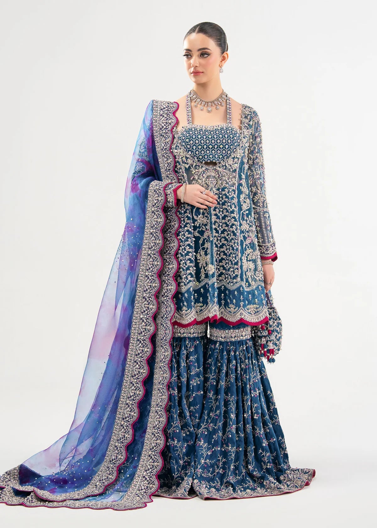 Exuding regal elegance, this organza ensemble is a masterpiece of artistry and detail. The shirt features intricately embroidered panels and an elongated neckline, layered over a fully embellished bustier that adds depth and grandeur. Colored charmeuse piping accents the design with a subtle pop, while the tie-dye dupatta, adorned with an ada spray and finished with heavily scalloped borders, lends a touch of modern charm. Completing the look, the traditional gharara showcases an elaborate jaal at the hem with a delicate spray above the gota, creating a harmonious balance of tradition and sophistication.