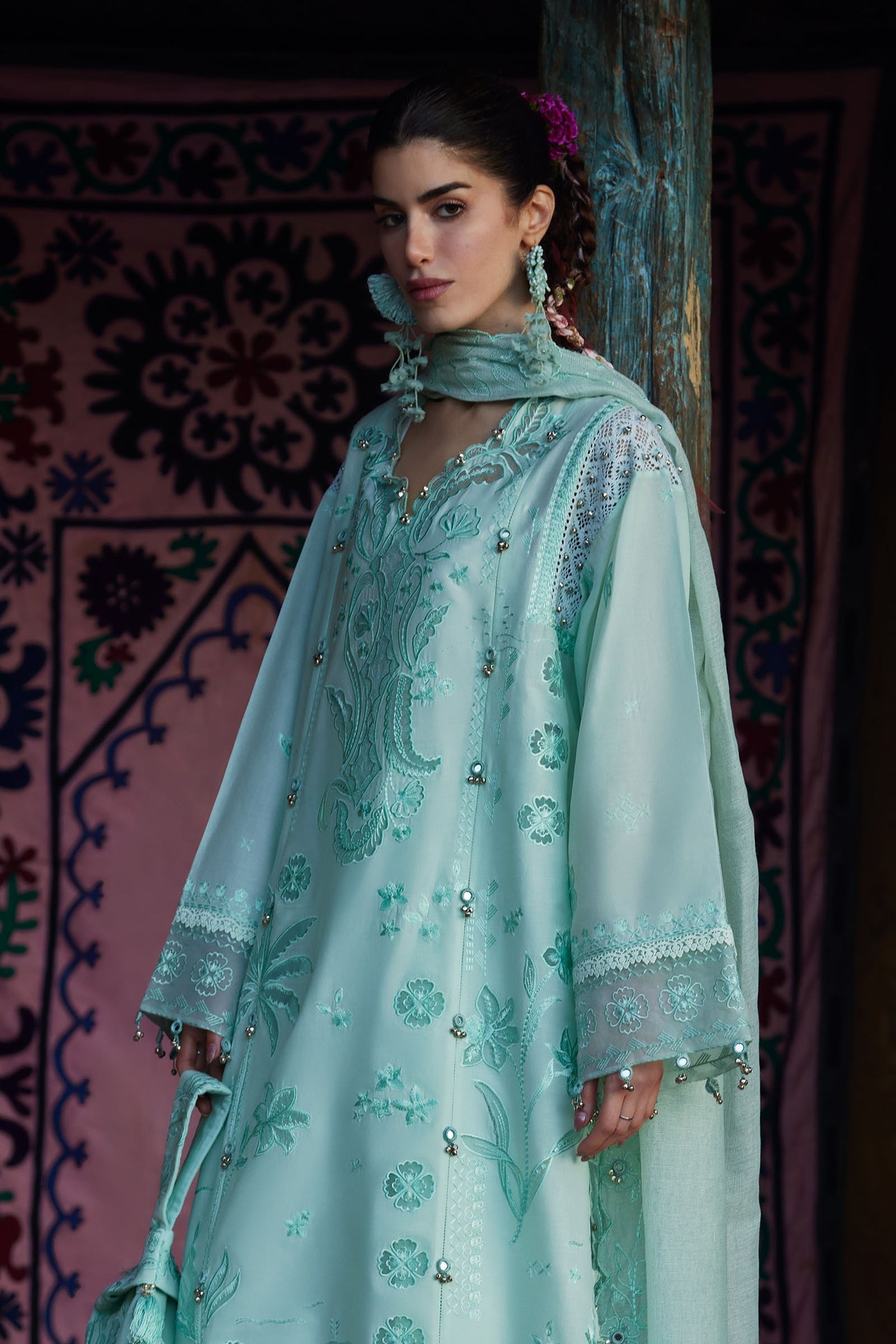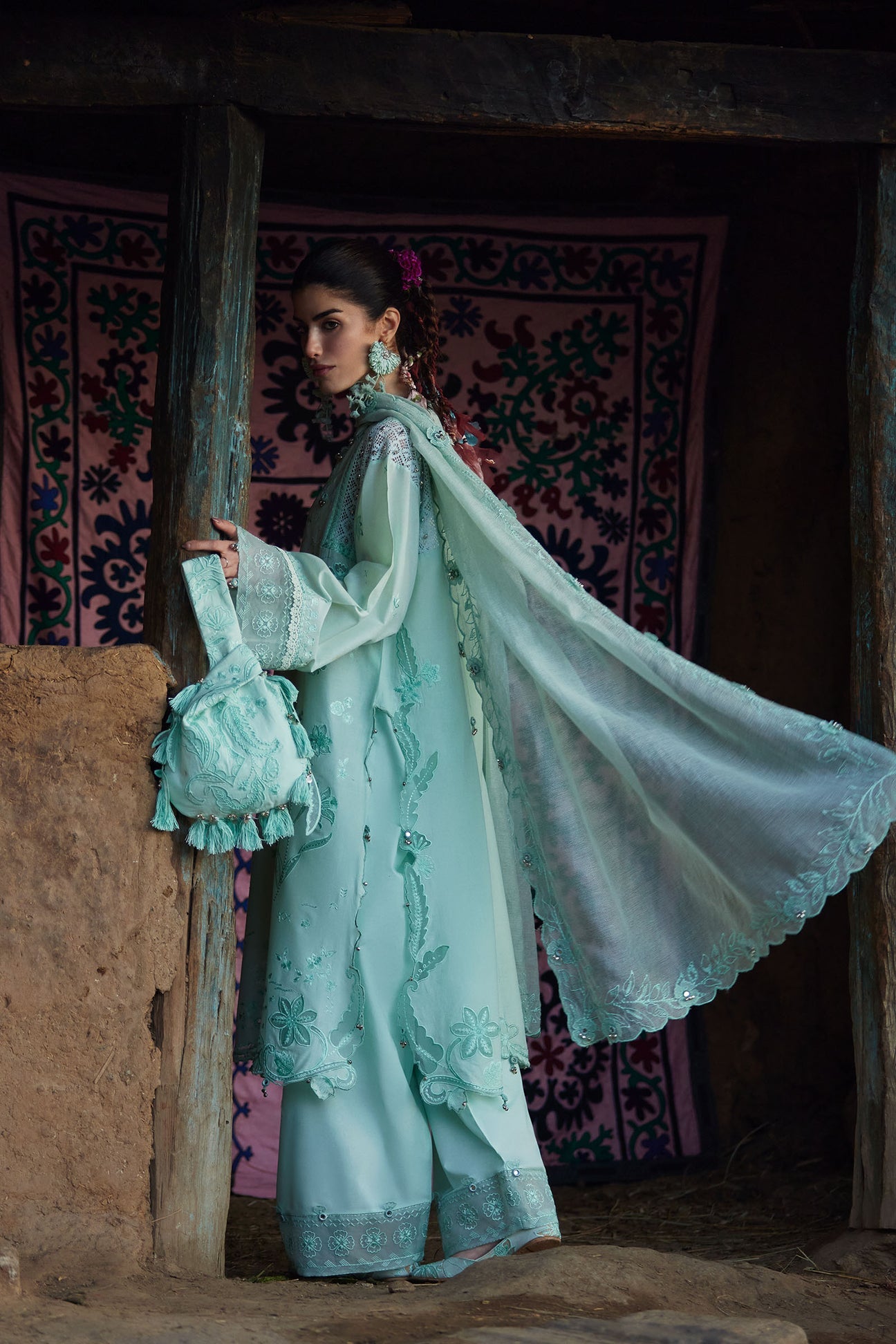 Finished with coordinating trousers and a light, textured dupatta, this colorway feels fresh, airy, and effortlessly graceful, a soft melody in tranquil mint hues.