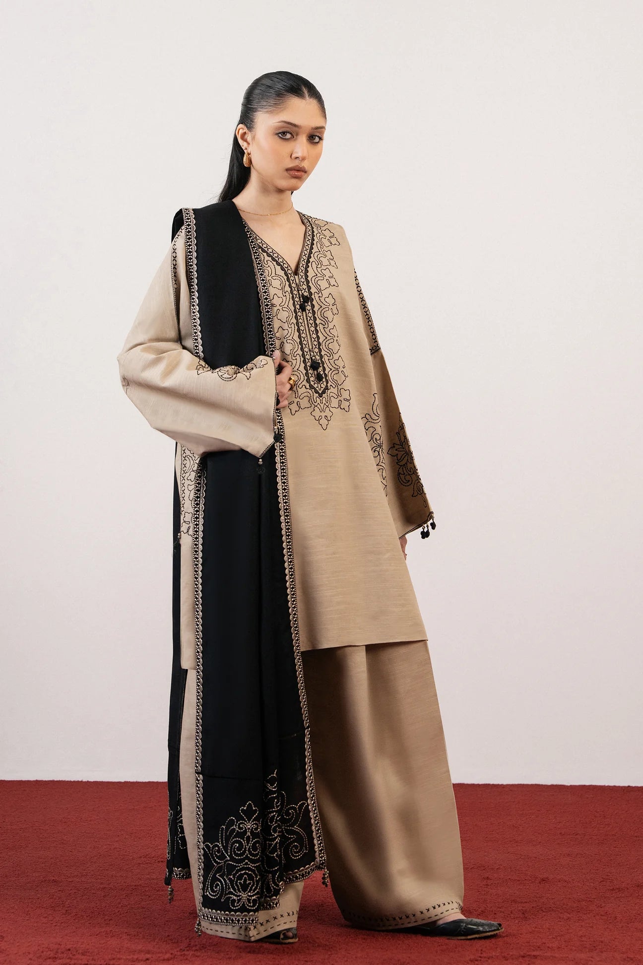 FÉRA — defined by quiet drama, this ensemble unfolds in soft beige, anchored by striking black embroidery tracing the neckline and sleeves with artisanal precision. The relaxed kurta silhouette flows with ease, layered for winter warmth without losing its structured grace.
