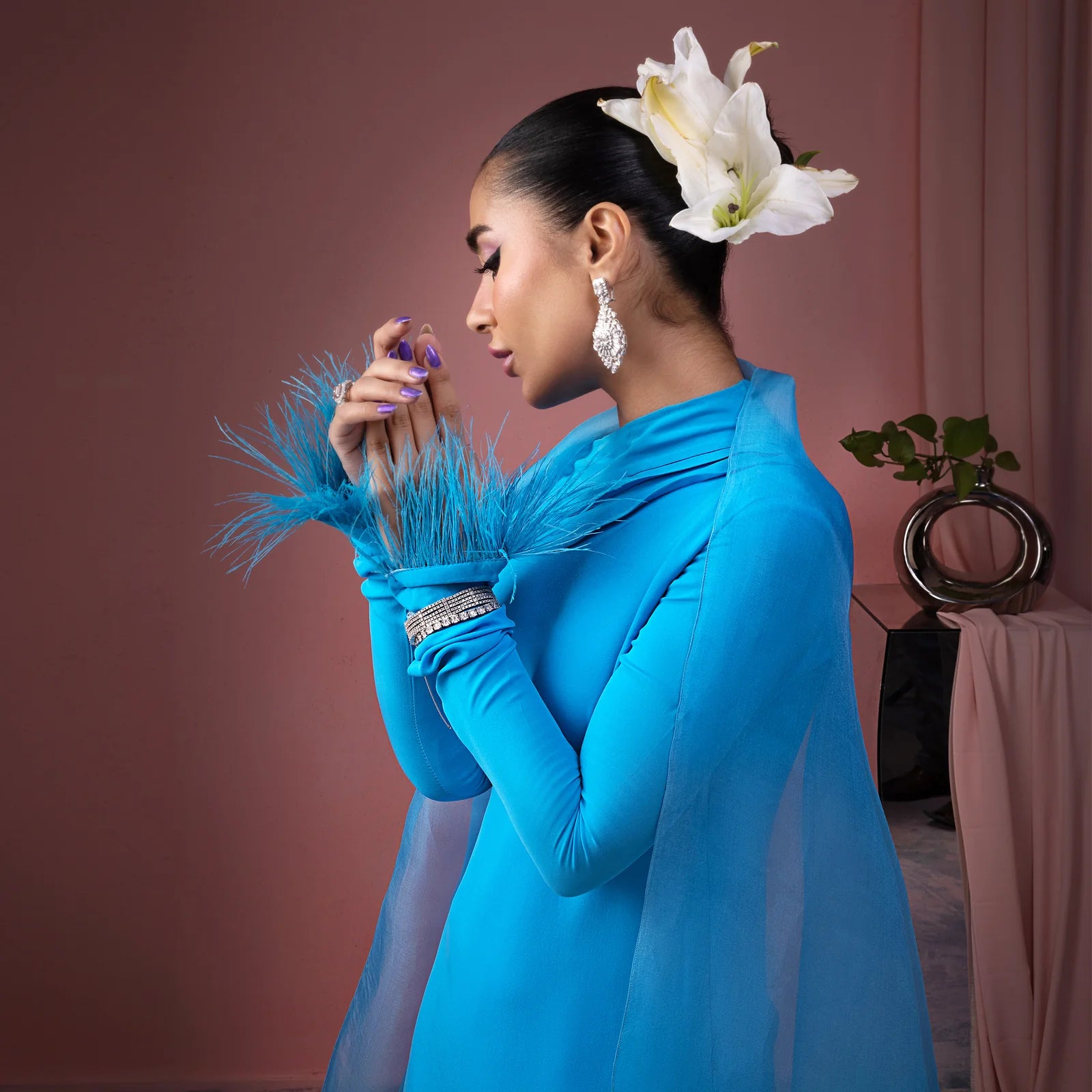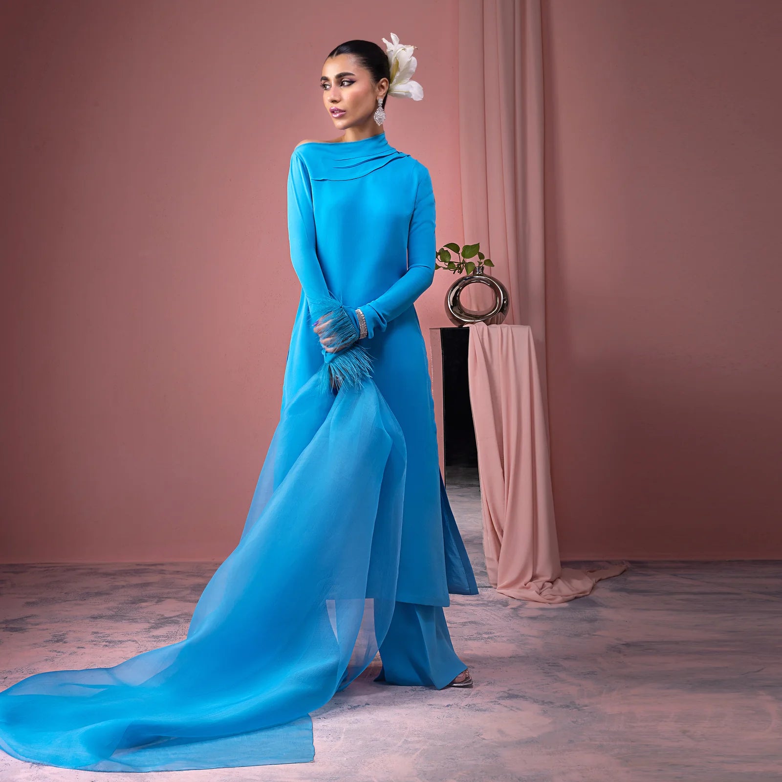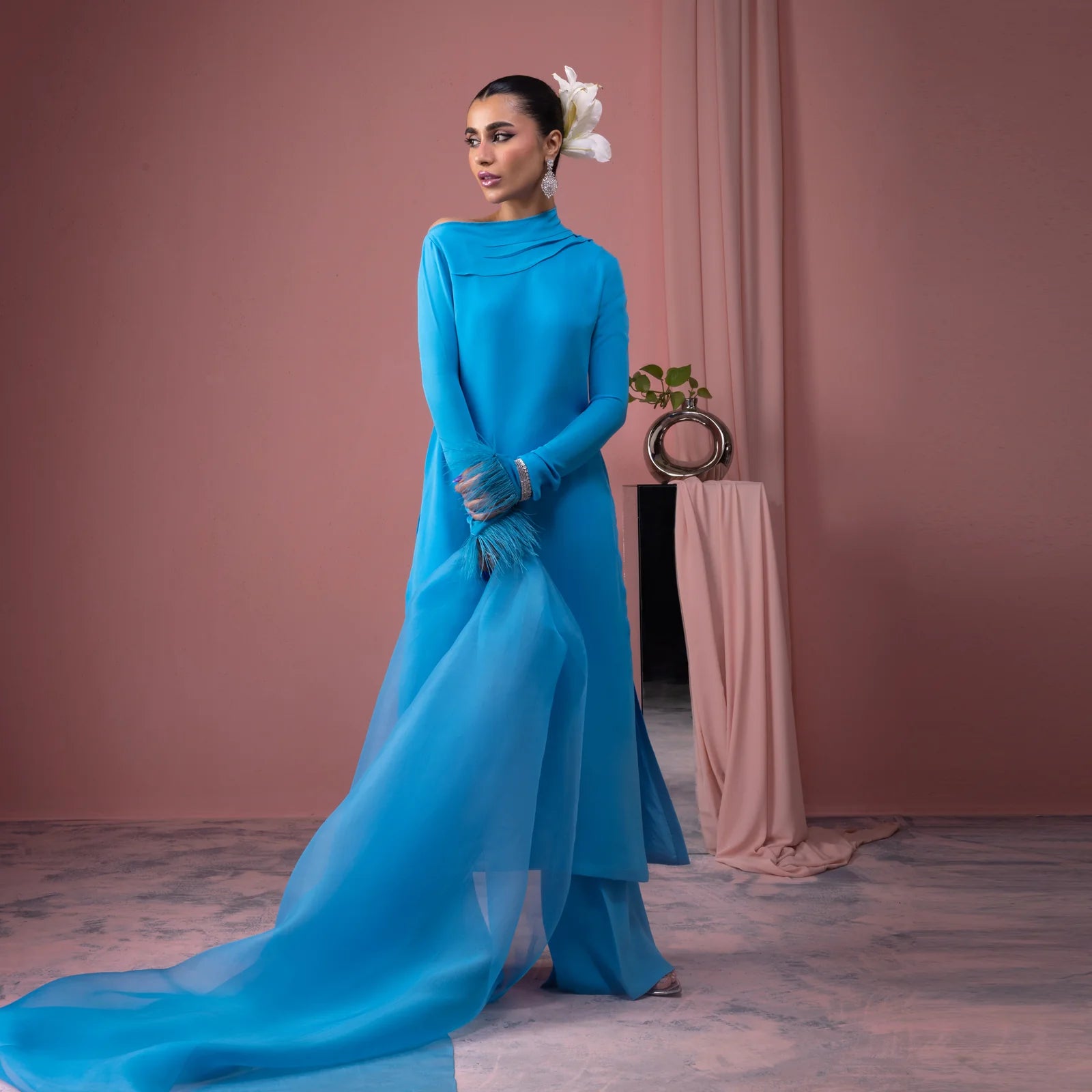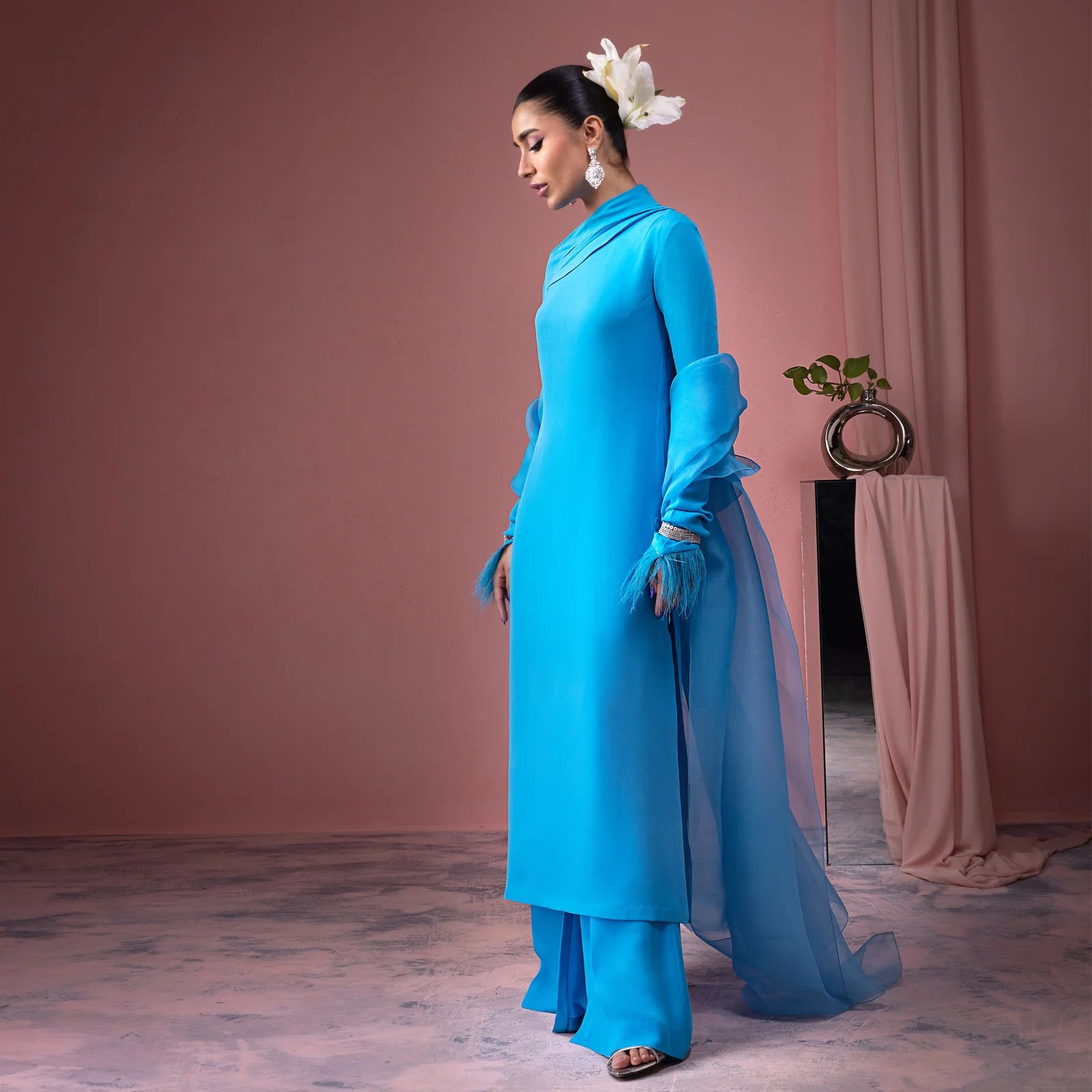 A serene Feroza georgette outfit featuring a long, straight kameez with full sleeves finished with delicate feather lace for a refined touch. The softly pleated neckline adds subtle texture and structure, while the straight trousers slightly flared at the hem lend a subtle hint of movement to the silhouette.