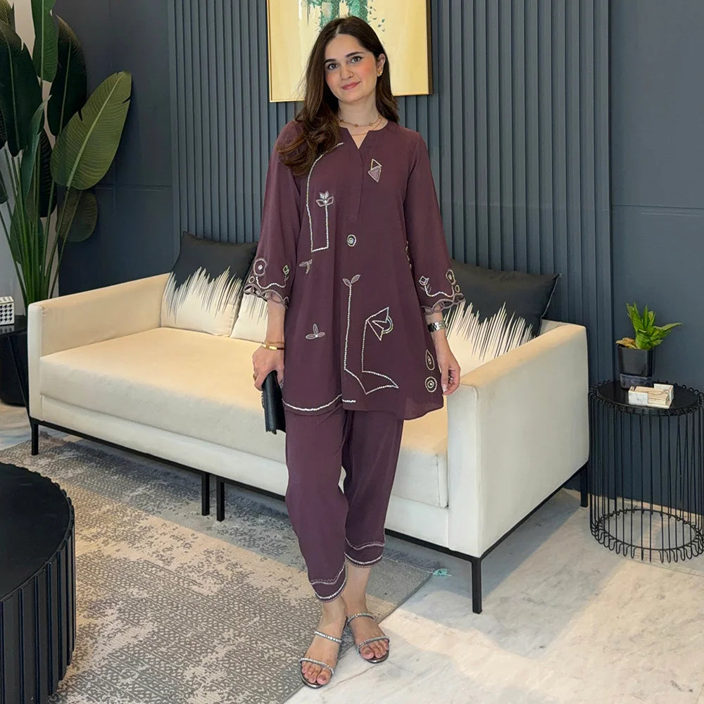 The Feya Set is a refined 2-piece textured georgette outfit The deep mauve shirt features detailed swarovski handwork and stunning embroideries spread across the front and sleeves, giving the piece a structured yet wearable look. Paired with matching embroidered and handwork skinny shalwar this set feels balanced and effortless.