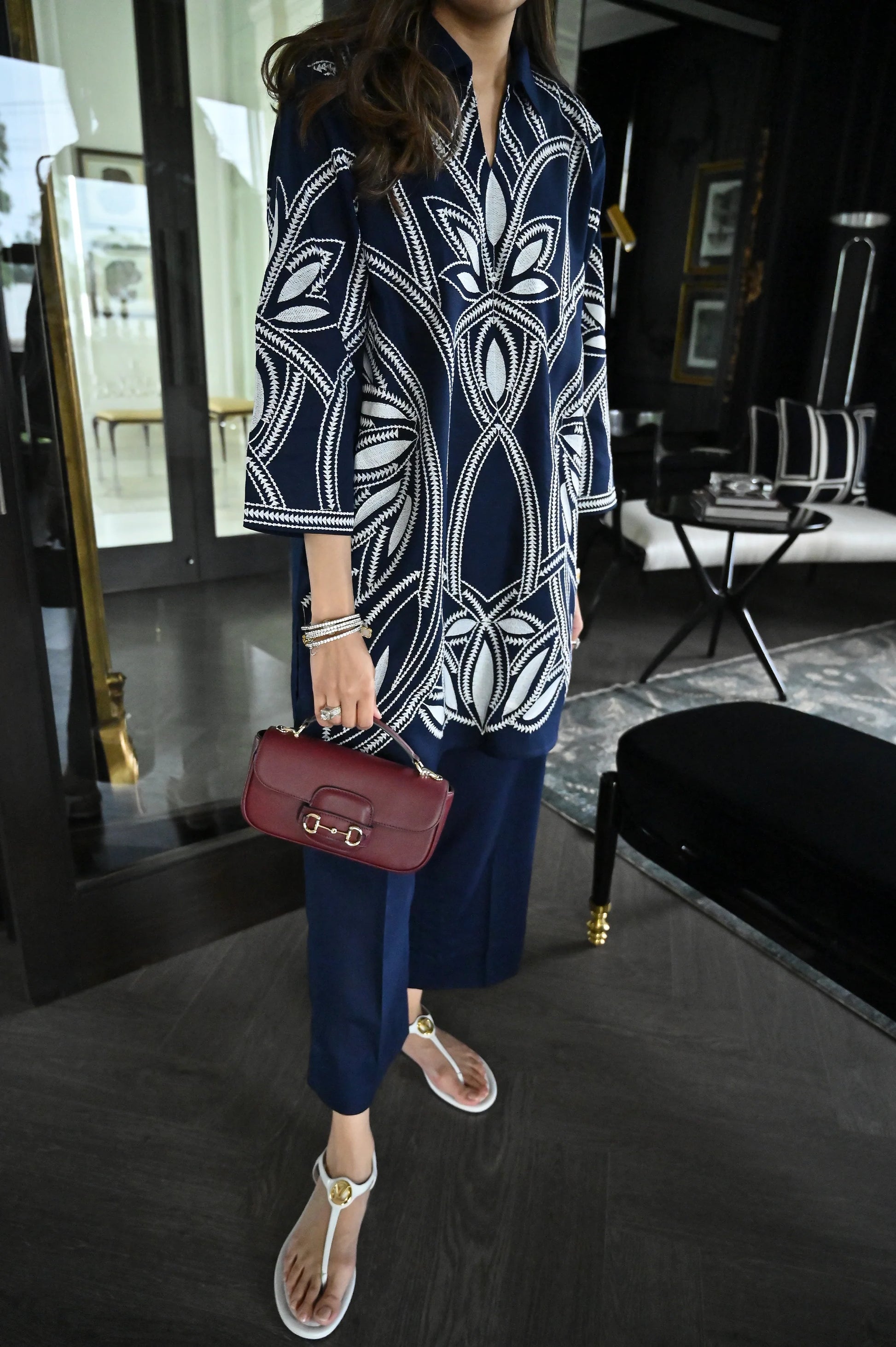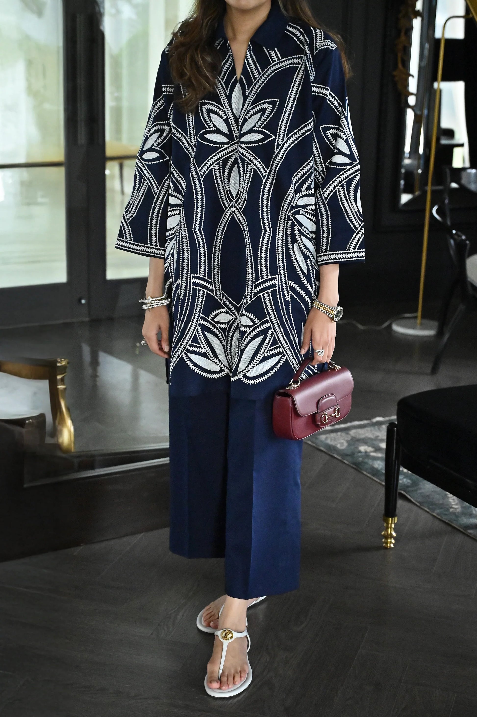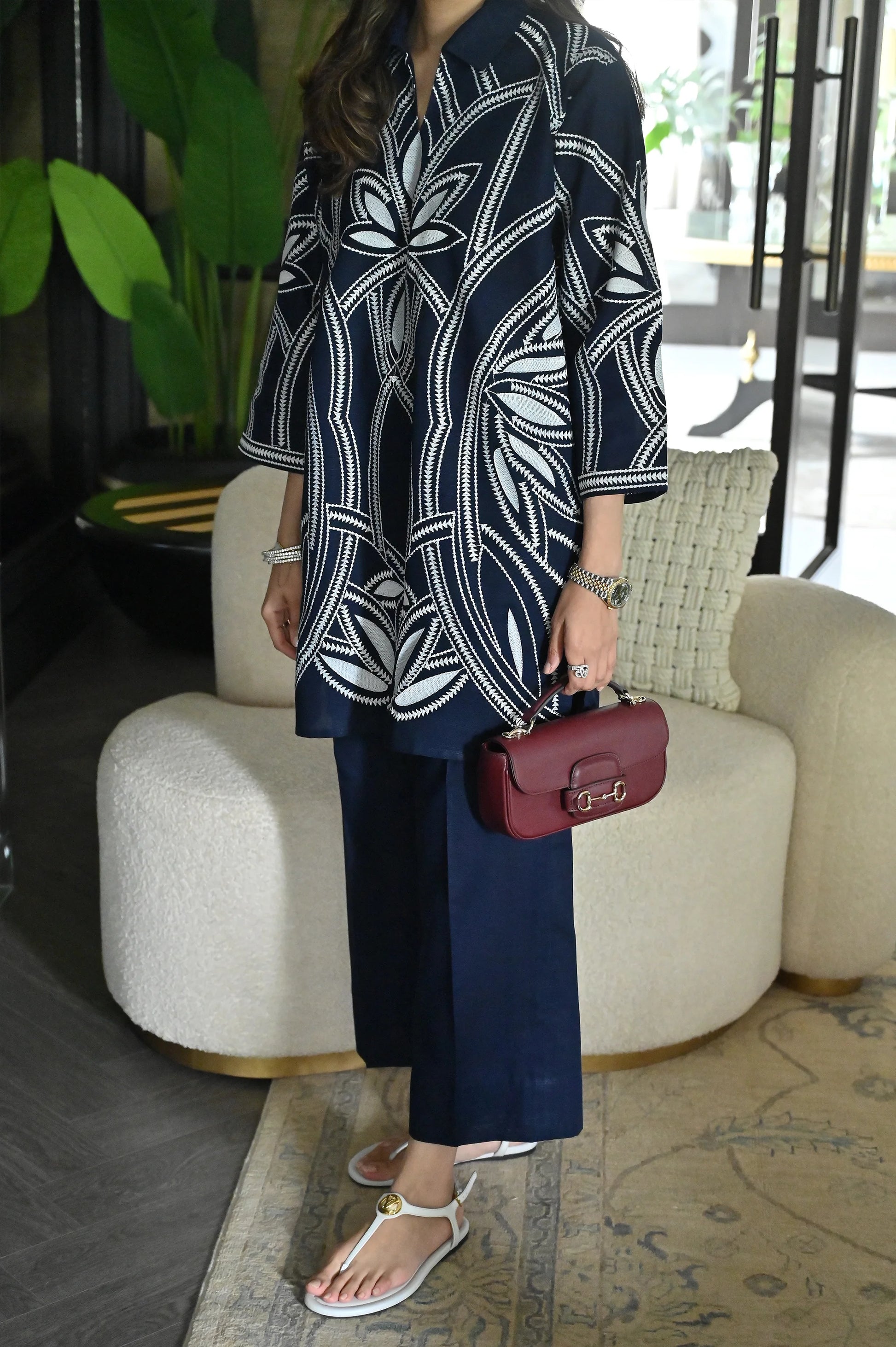 The Feya Set is a refined 2-piece khaddar outfit. The deep navy shirt features detailed white embroidery spread across the front and sleeves, giving the piece a structured yet wearable look. The neckline and relaxed sleeves keep it easy and flattering. Paired with matching wide-leg trousers, this set feels balanced and effortless.