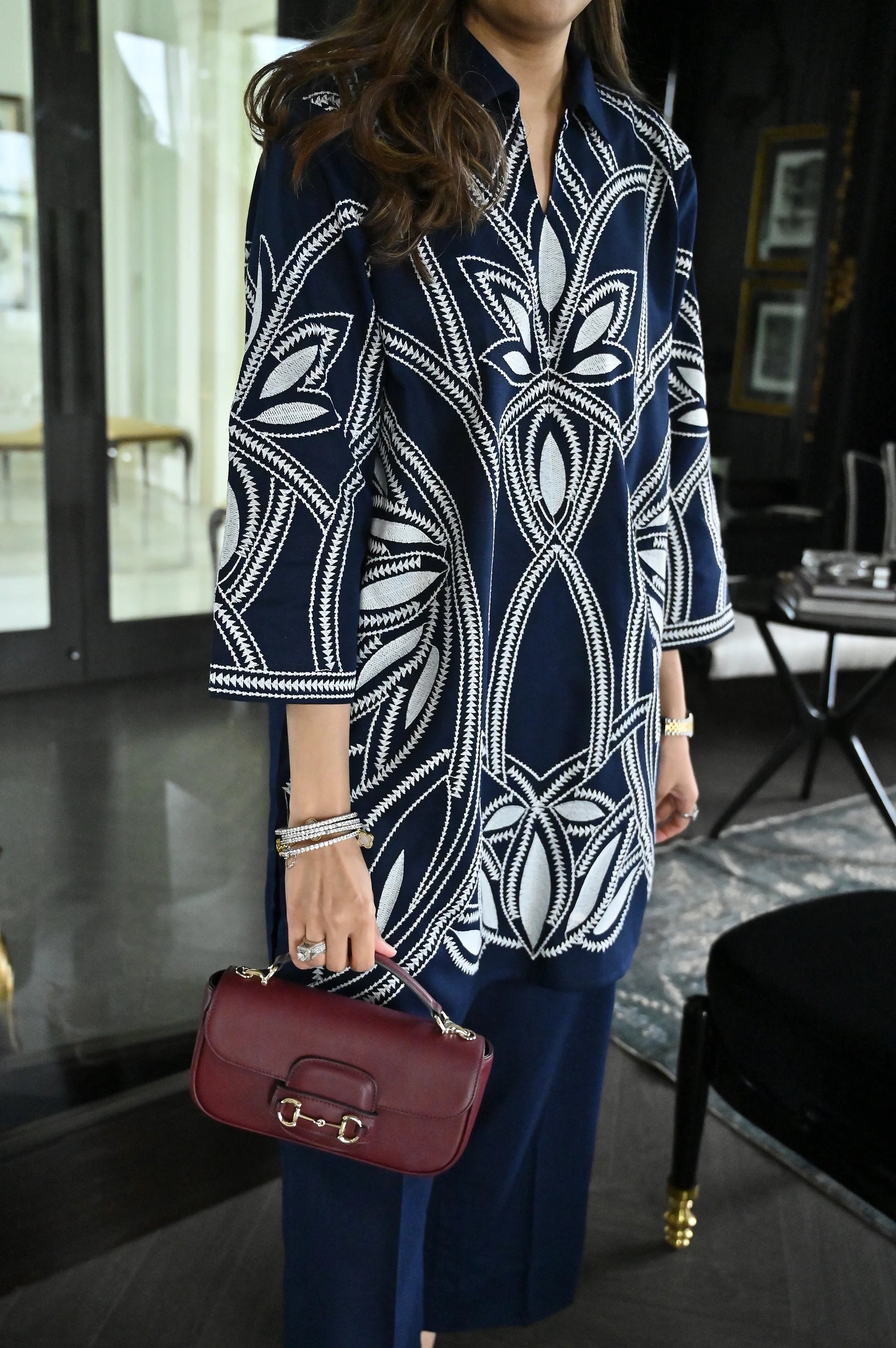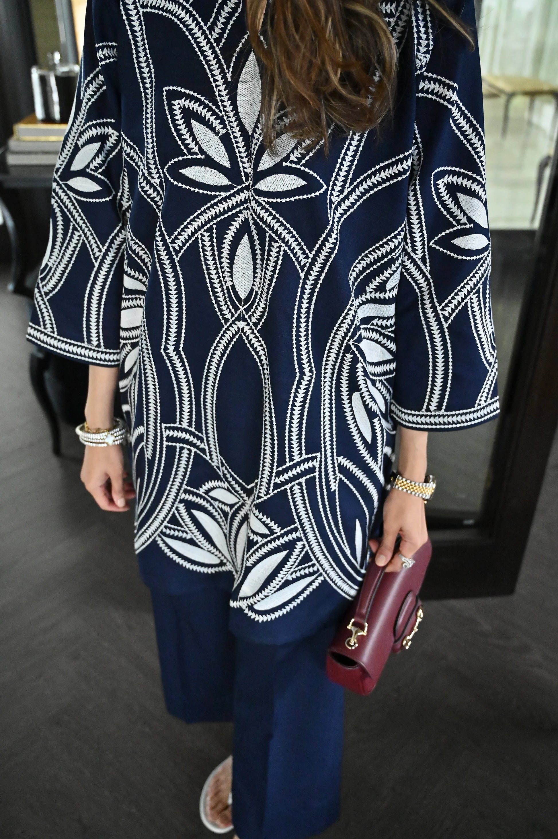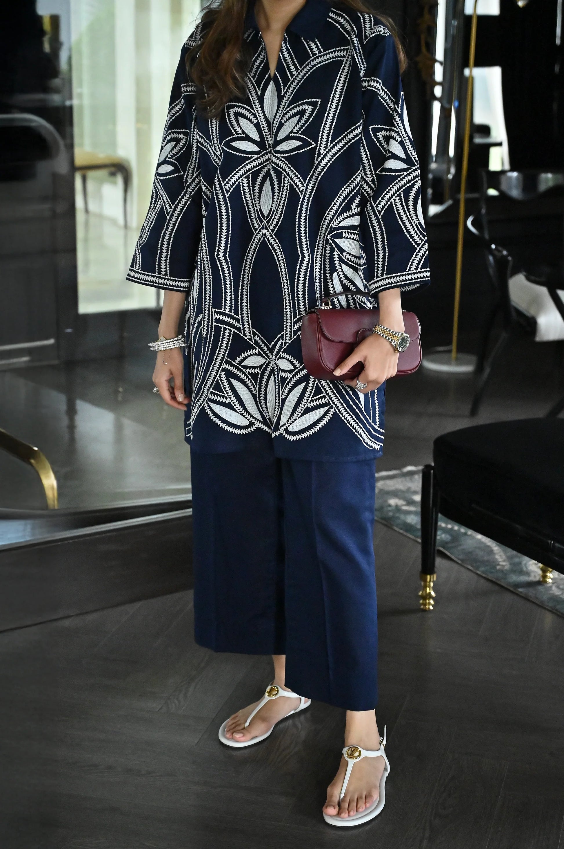 The Feya Set is a refined 2-piece khaddar outfit. The deep navy shirt features detailed white embroidery spread across the front and sleeves, giving the piece a structured yet wearable look. The neckline and relaxed sleeves keep it easy and flattering. Paired with matching wide-leg trousers, this set feels balanced and effortless.