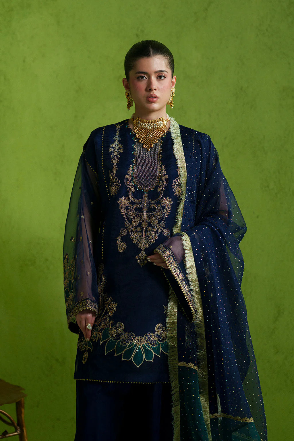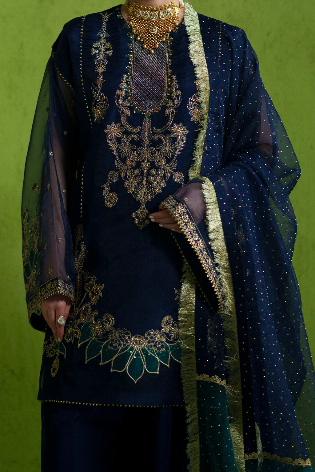 A rich and classy color-blocked ensemble featuring a fully embellished shirt, paired with a heavy stone-worked organza dupatta and a plain bottom for a refined, luxurious look.