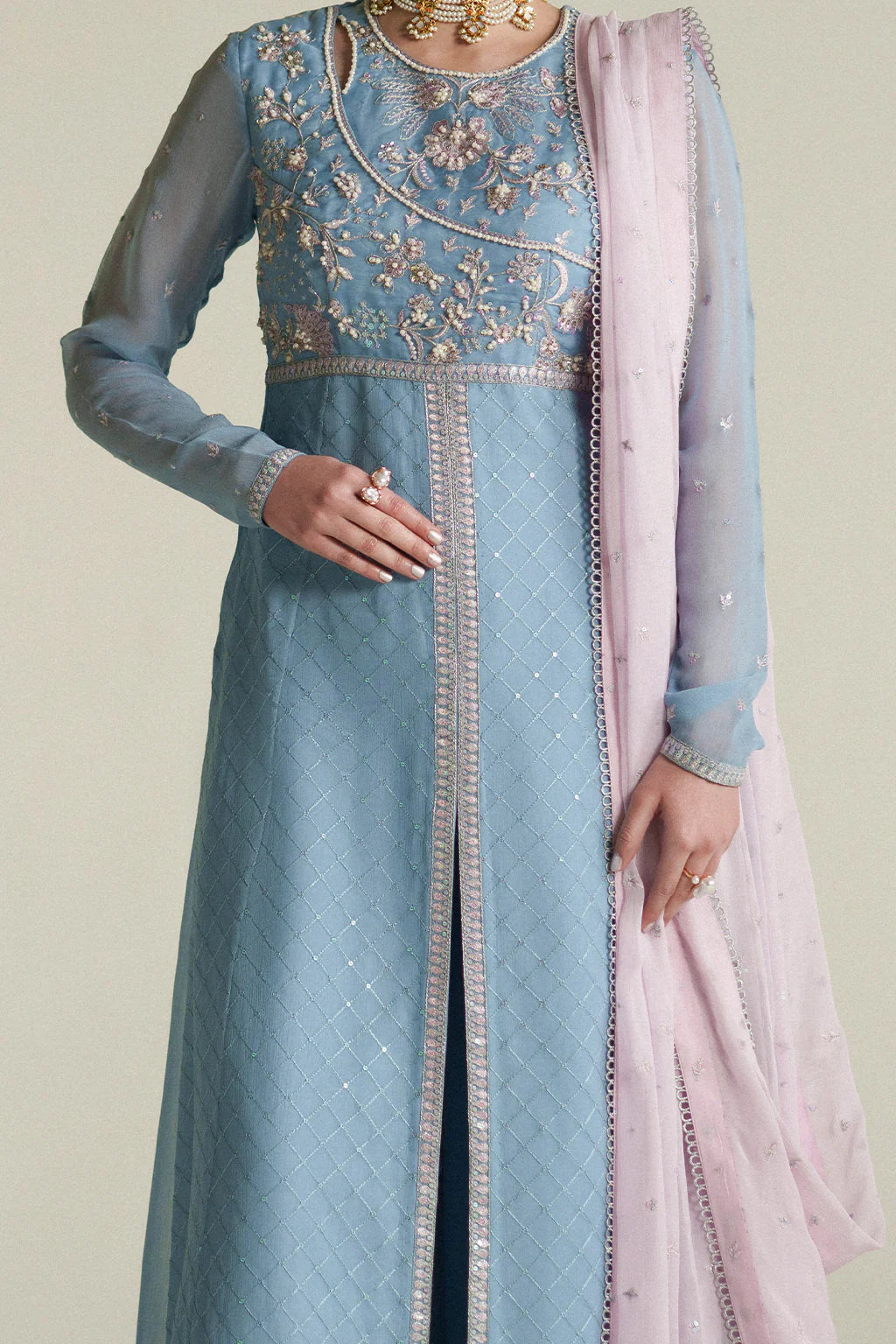 A soft pastel fusion-cut shirt featuring a delicately embroidered and hand-embellished bodice, paired with a contrasting dupatta and sharara for an elegant, contemporary look.