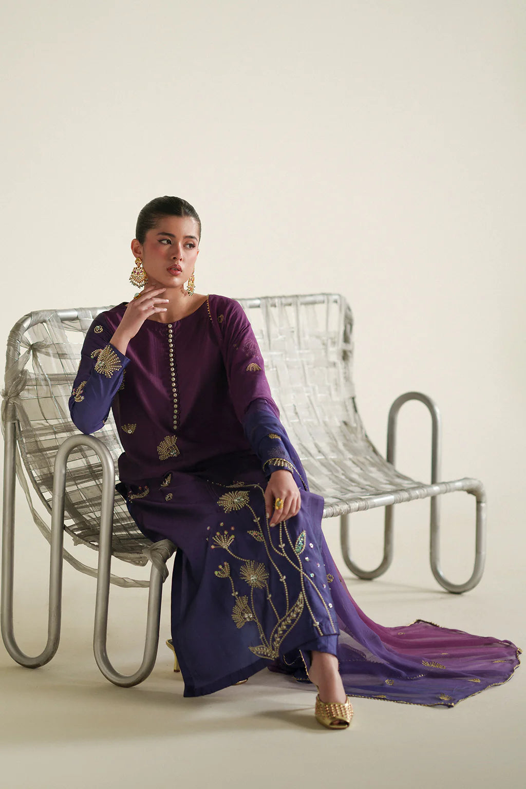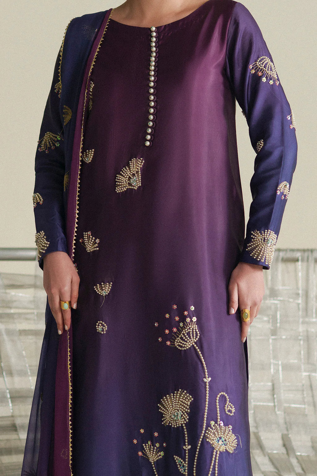 A classy and delicate silk long shirt intricately detailed with hand embellishments paired with plain trousers and a printed chiffon dupatta.