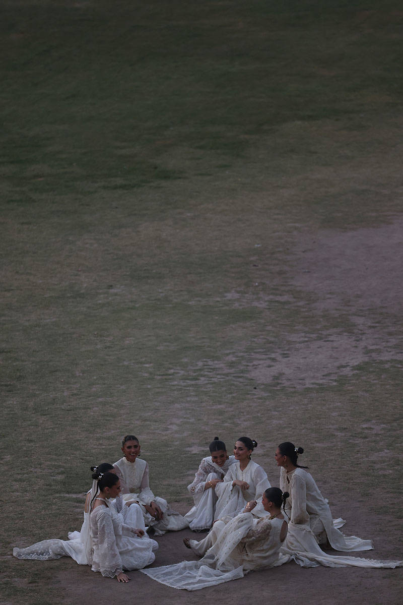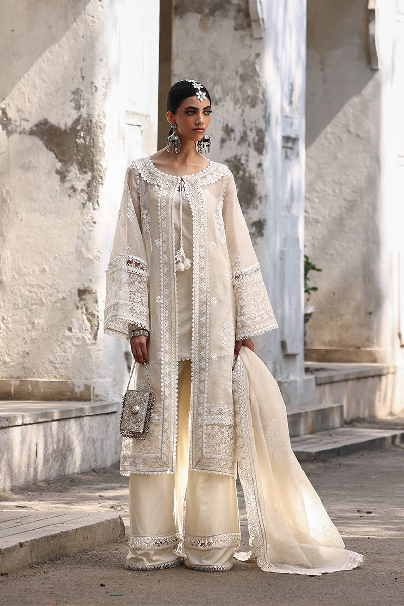 This open-front shirt in kulla karandi is designed to float over a cotton net slip, its sheerness offset by floral boring embroidery and scalloped edges done in decorative trims. The play of shadow and structure is balanced by wide-legged trousers with beautiful trims at the hem and delicately hand-embellished with pearls. The dupatta in matching kulla karandi is block-printed with three separate motifs, each framed by scalloped embroidery and finished with multi-head embroidery. It makes for an Eid ensemble that reads like poetry in texture.