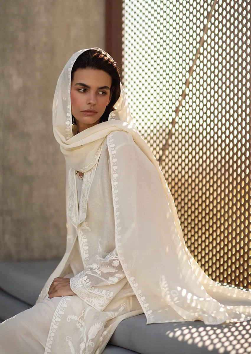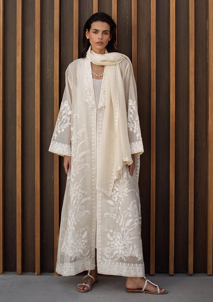 Fifi Ivory is a study in monochromatic elegance, reimagining the traditional abaya through a lens of artisanal texture. Crafted from khaddi corduroy, the fabric provides a structured yet breathable base for elaborate tonal embroidery. Paired with a charmeuse slip dress and an embroidered georgette sheila, the design explores a botanical narrative, with climbing floral vines and delicate foliage rising gracefully from the hem.