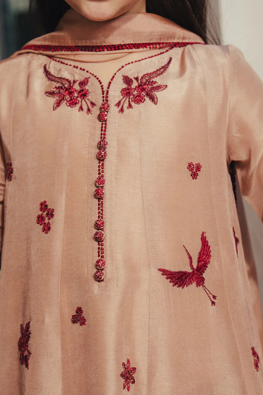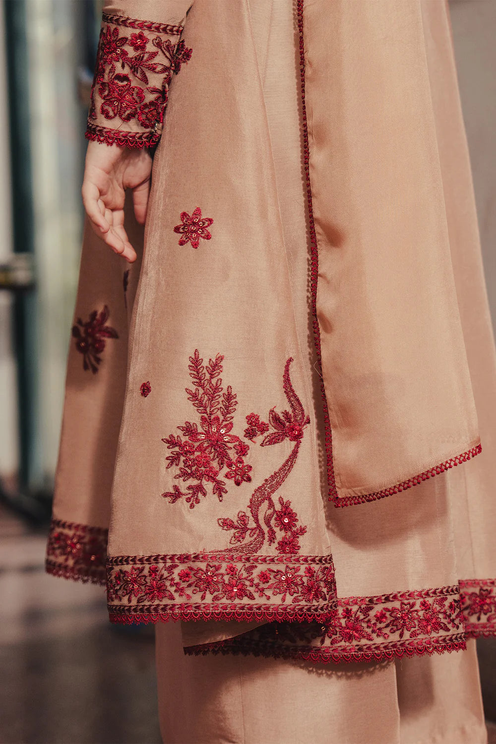 A beige ensemble featuring a paneled shirt adorned with bold gara embroidery, paired with loose-fit pants and a silk embroidered dupatta.