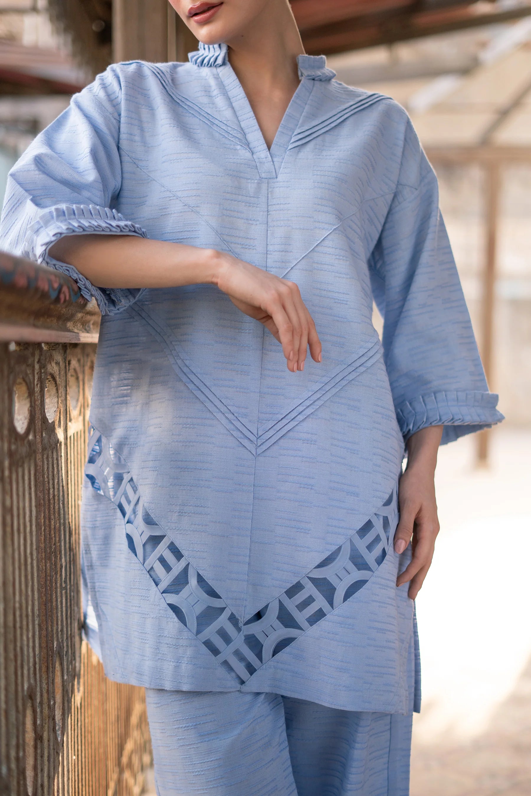 This serene powder-blue co-ord features a relaxed silhouette with intricate geometric cutwork detailing across the hem. The kurta boasts a structured neckline with subtle pleats and panel accents, paired with wide-leg pants