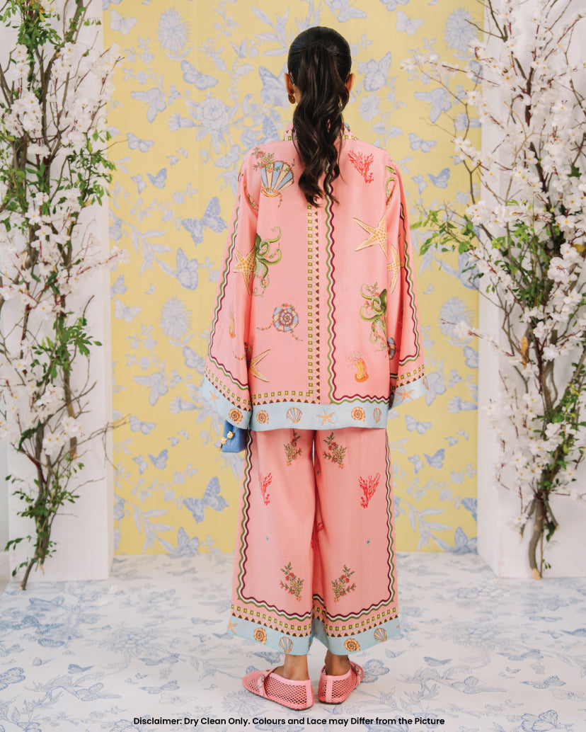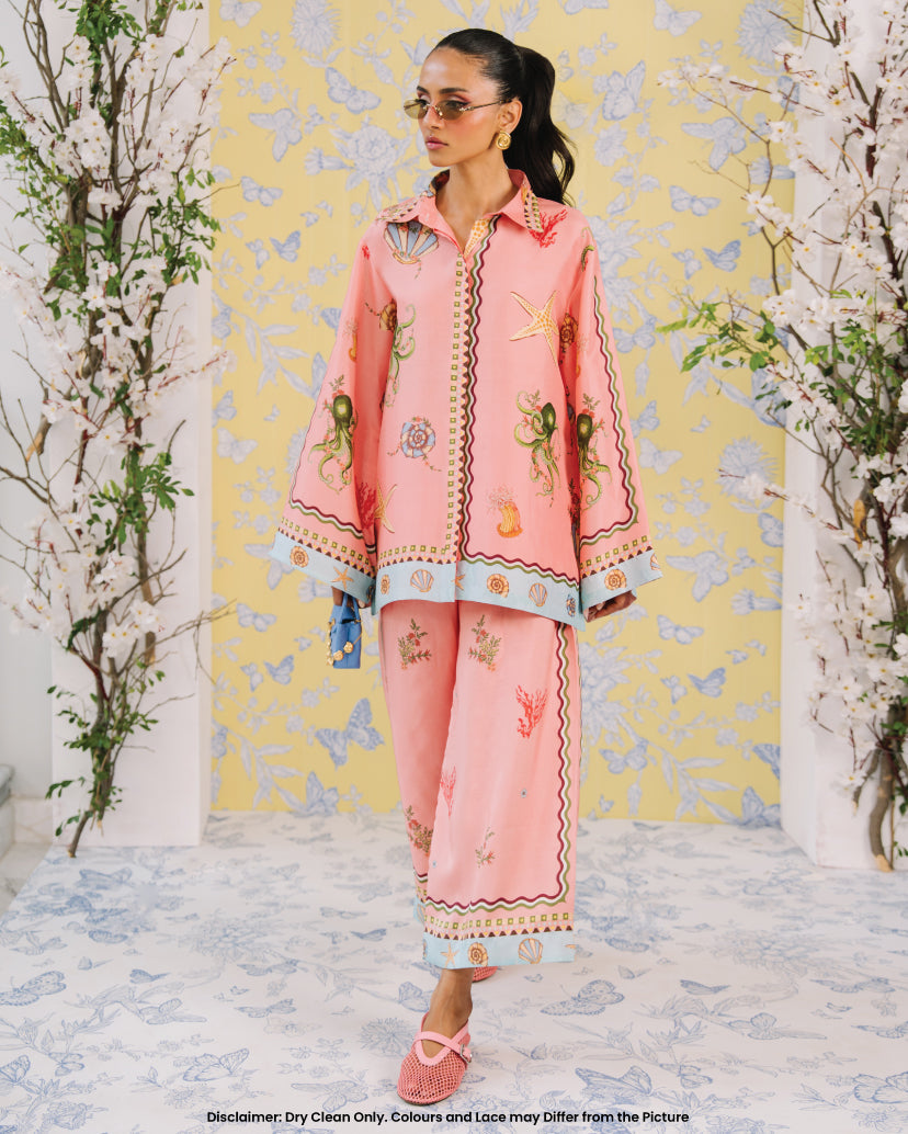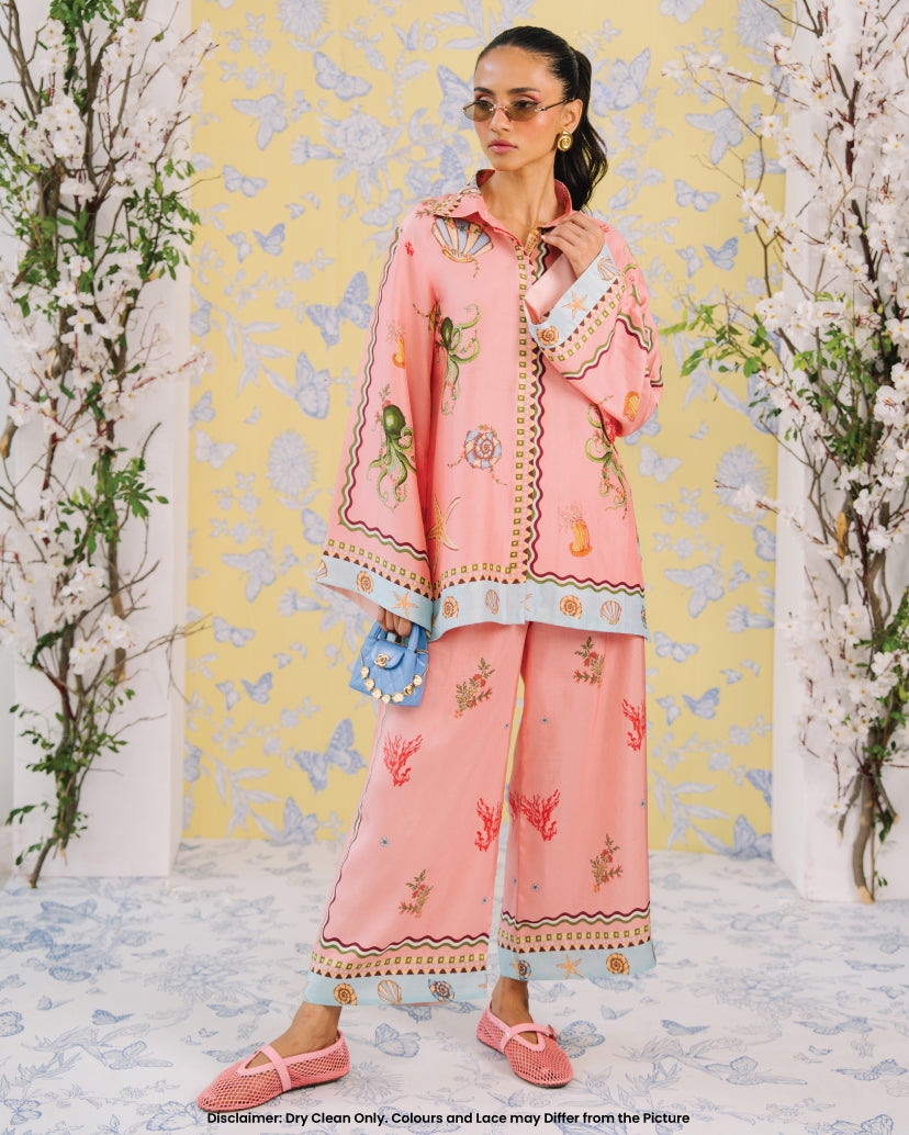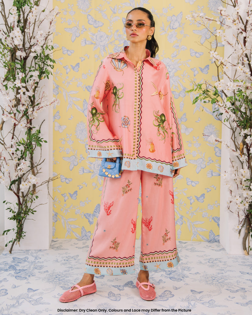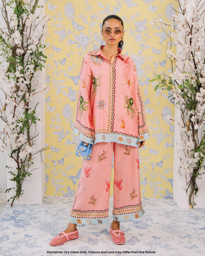 Crafted from luxurious 60-gram silk, this coral co-ord set features vibrant botanical prints, wide statement sleeves, and relaxed trousers.