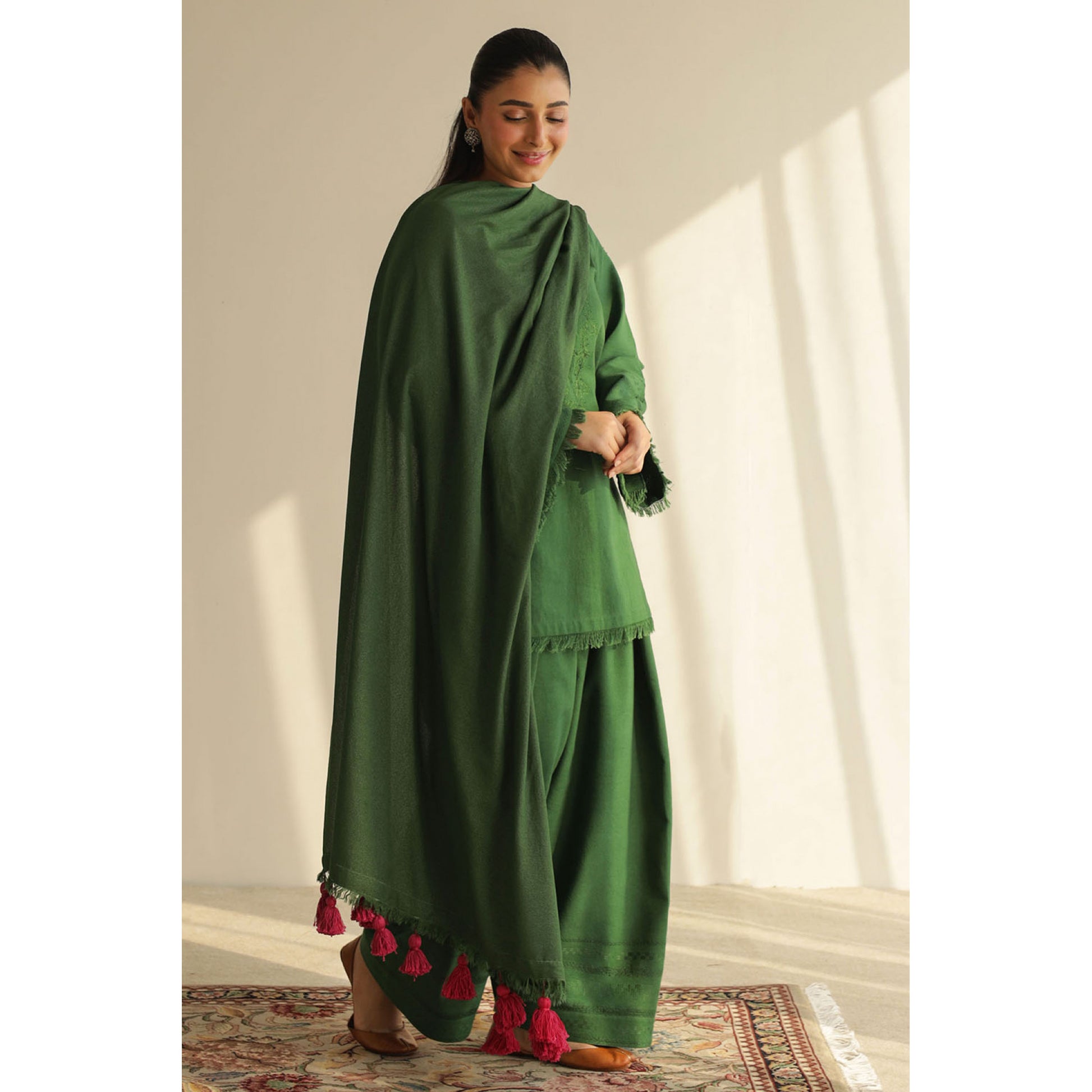 Forest Green Tarkashi sooti khaddar shalwar kameez with self-embroidery.