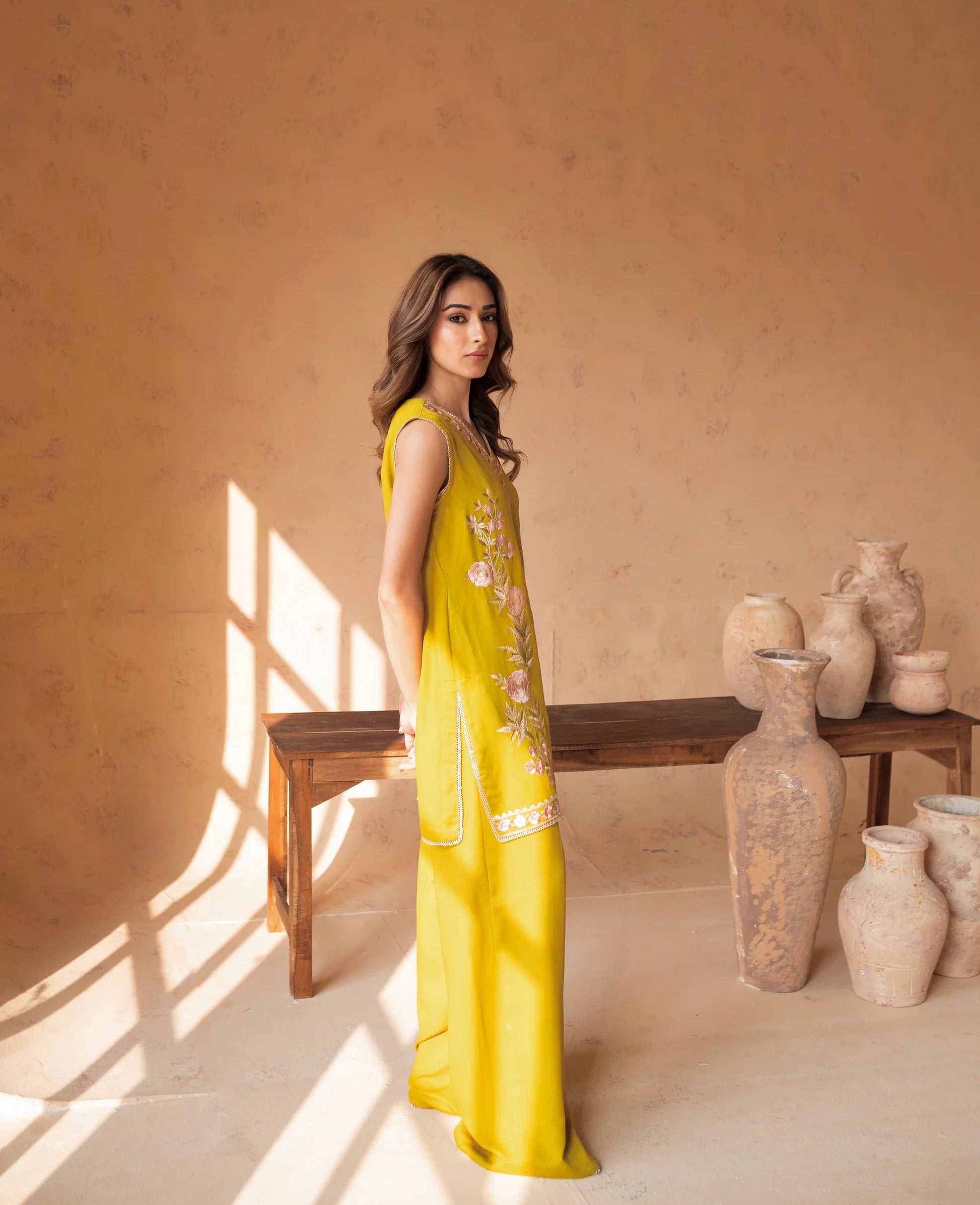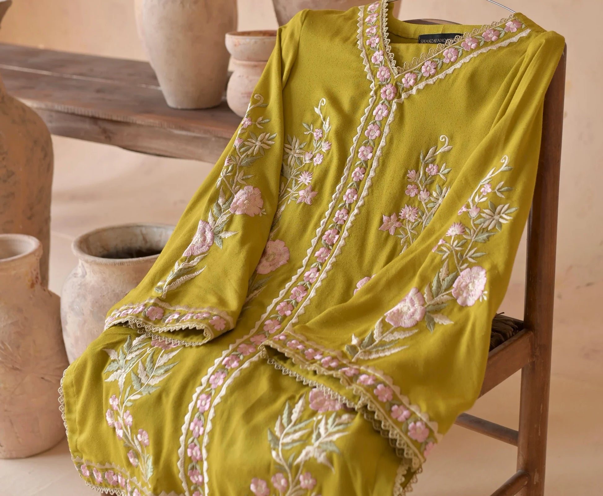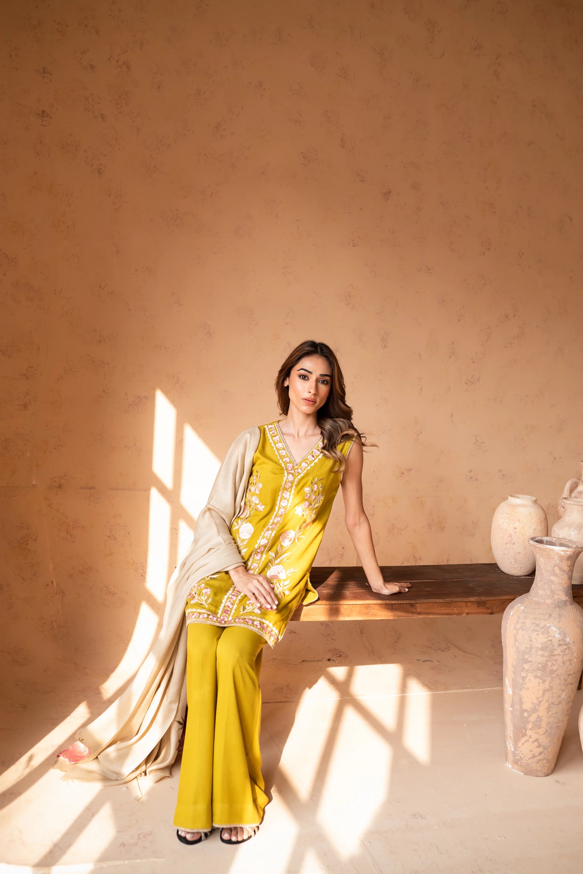 Bringing you a vibrant shade of green like no other- our “Freesia” ensemble. Fully embroidered with dreamy florals, Freesia has a modern twist to it with loose wide legged pants. Paired with a contrasting shawl with blooming floral embroidery, Freesia is what you have been looking for all along.