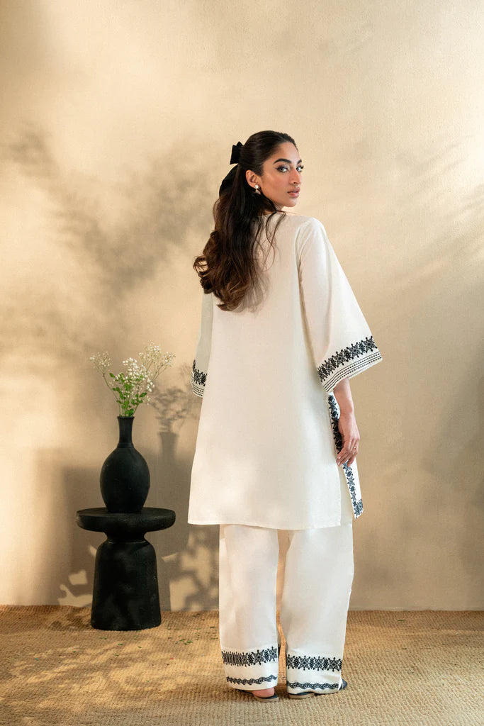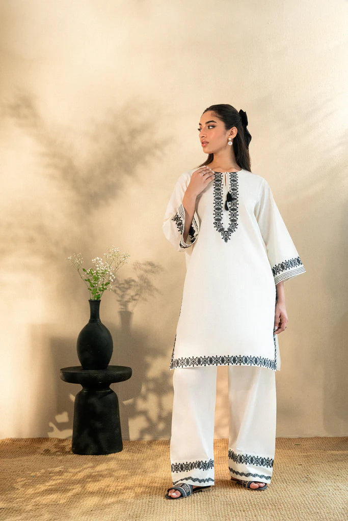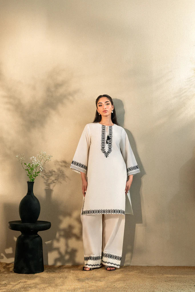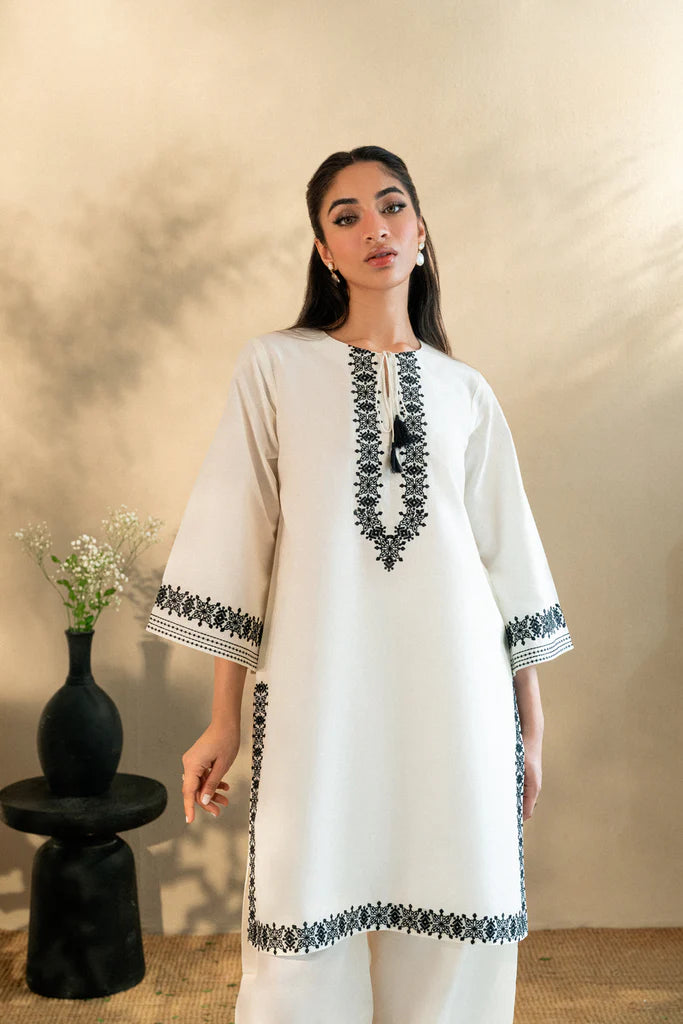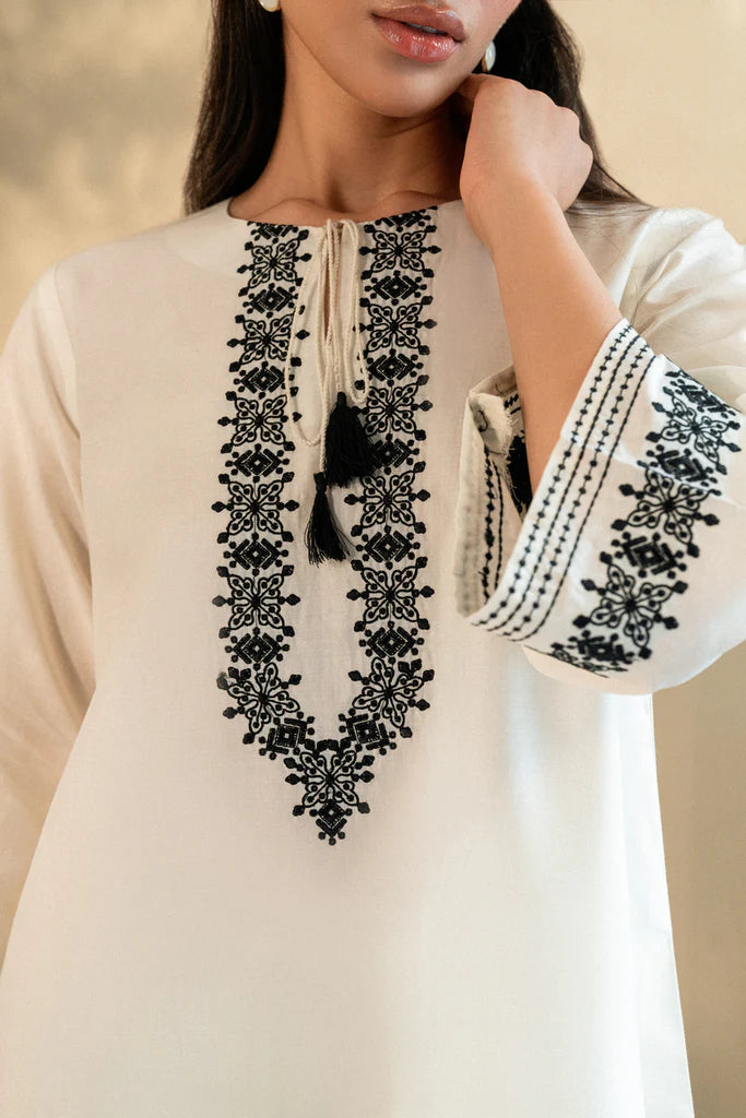 Classic yet detailed, this kurta features intricate black threadwork on a creamy cotton canvas. The round neckline with tassel ties brings ease, while symmetrical embroidery graces the neckline, cuffs, borders, and trousers.