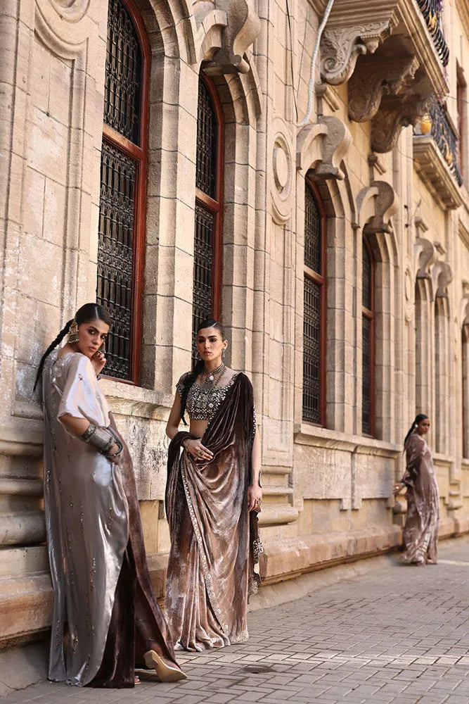 An elegant kaftan crafted in luxurious pure velvet in a soft beige ombre hue, featuring intricate silver appliqué work and all-over hand-embroidered boties. The exquisite detailing includes imported crystals, stones, moti, and dabka, showcasing exceptional craftsmanship. Paired with cotton charmeuse pants in dark beige for comfort and balance, and complemented with a beige lame chiffon cape, this ensemble exudes sophistication, grace, and contemporary elegance.
