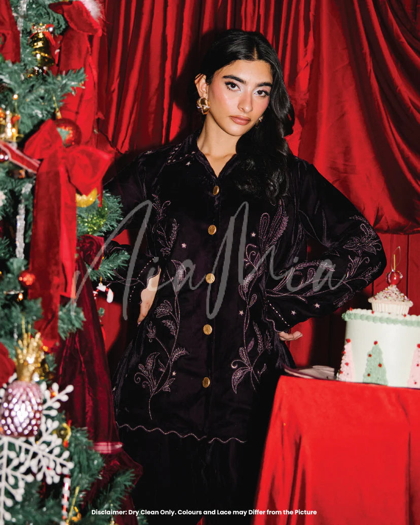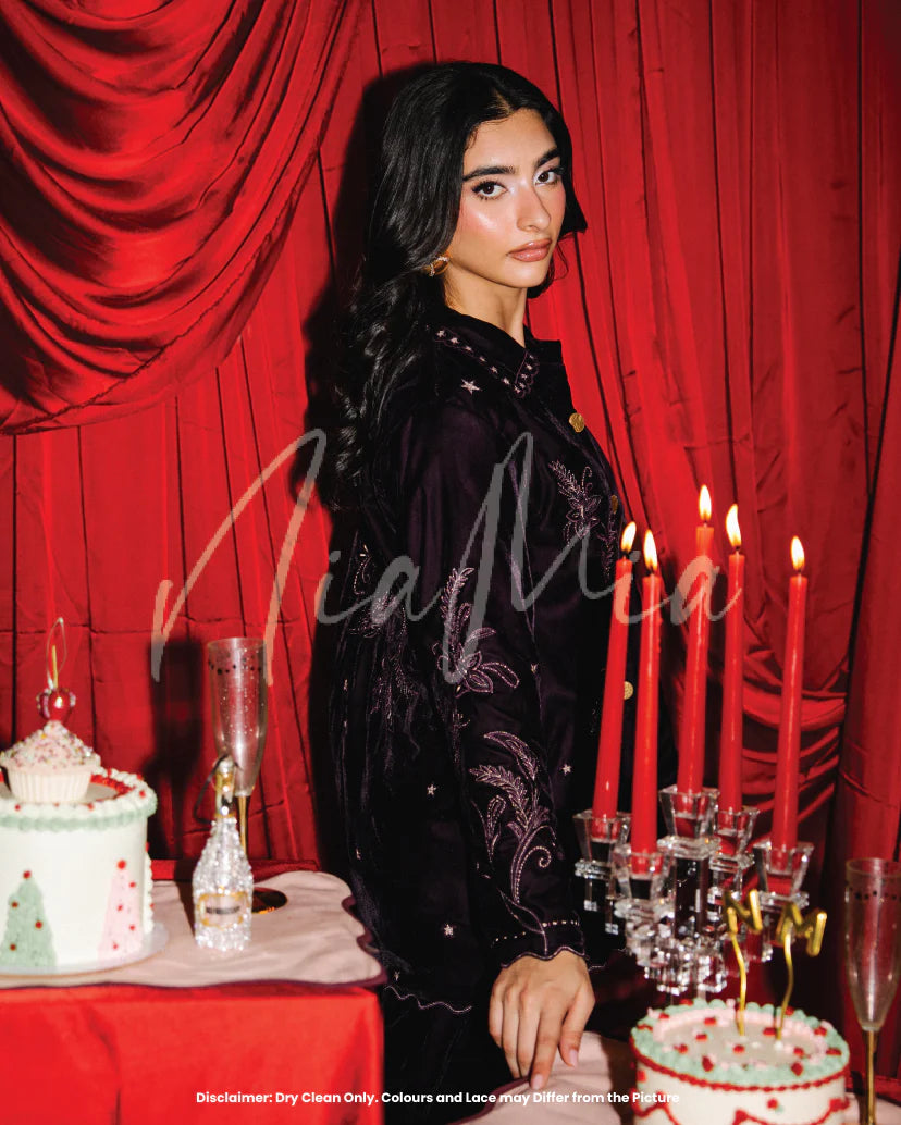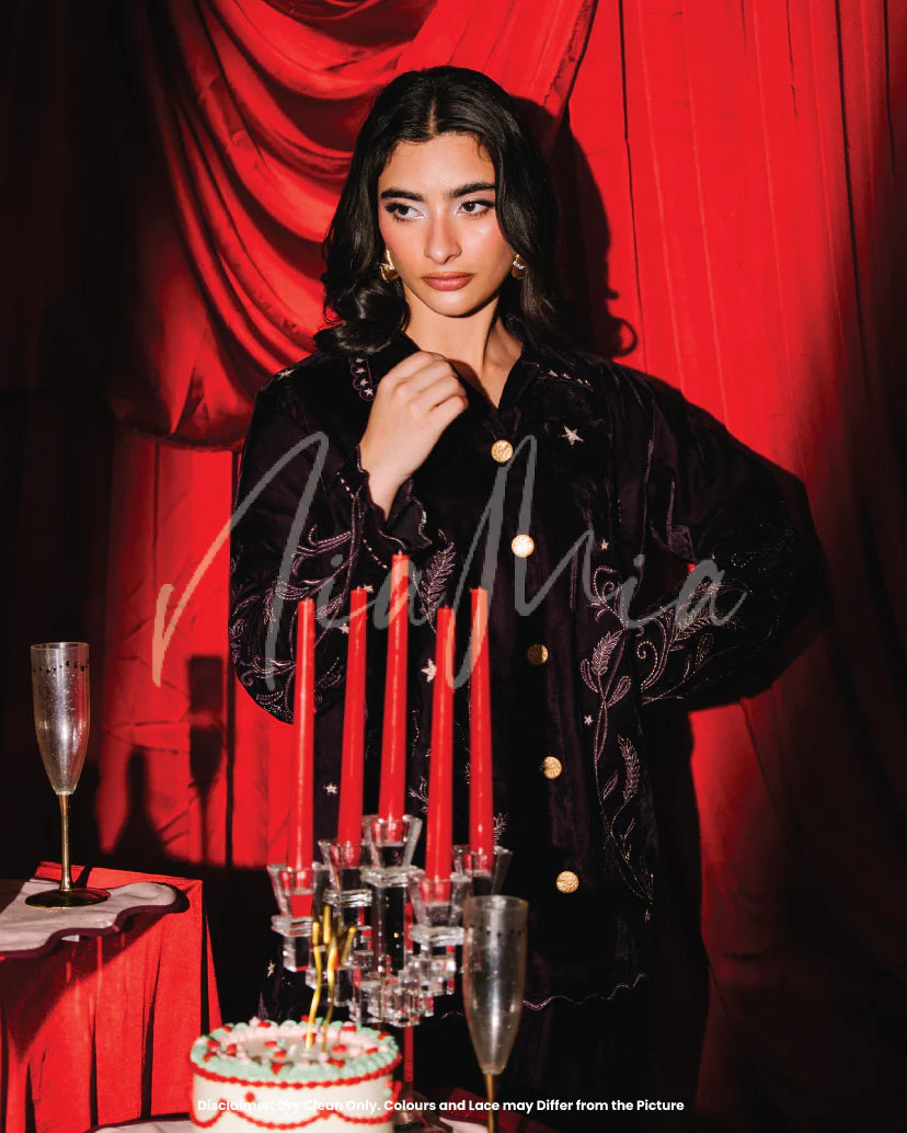 Galaxy combines plush velvet with elegant contrast embroidery and refined button detailing for a polished winter look. Its structured yet relaxed silhouette makes it versatile for both evening wear and festive gatherings.