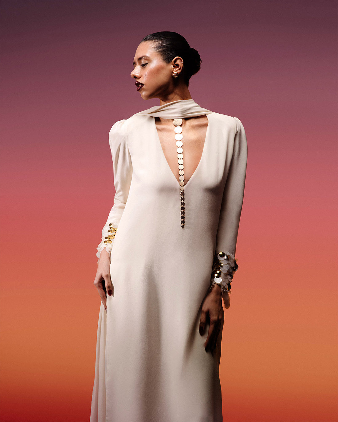 This chic two-piece set features a base fabric of grip, offering both comfort and structure. The long shirt, flowing yet tailored, showcases intricate embellishments of metal coins and sequins, adding a touch of glamour and texture to the ensemble. Paired with matching pants, the outfit exudes effortless sophistication, blending modern design with traditional flair. The shimmering embellishments make it perfect for evening events or special occasions where style and subtle opulence are key.