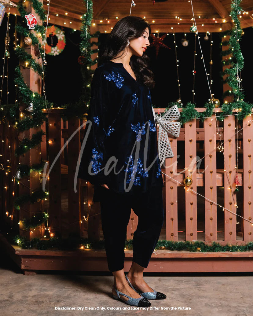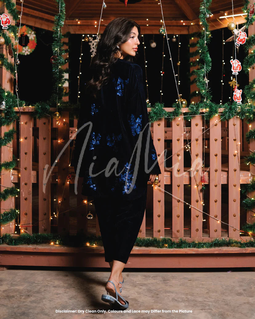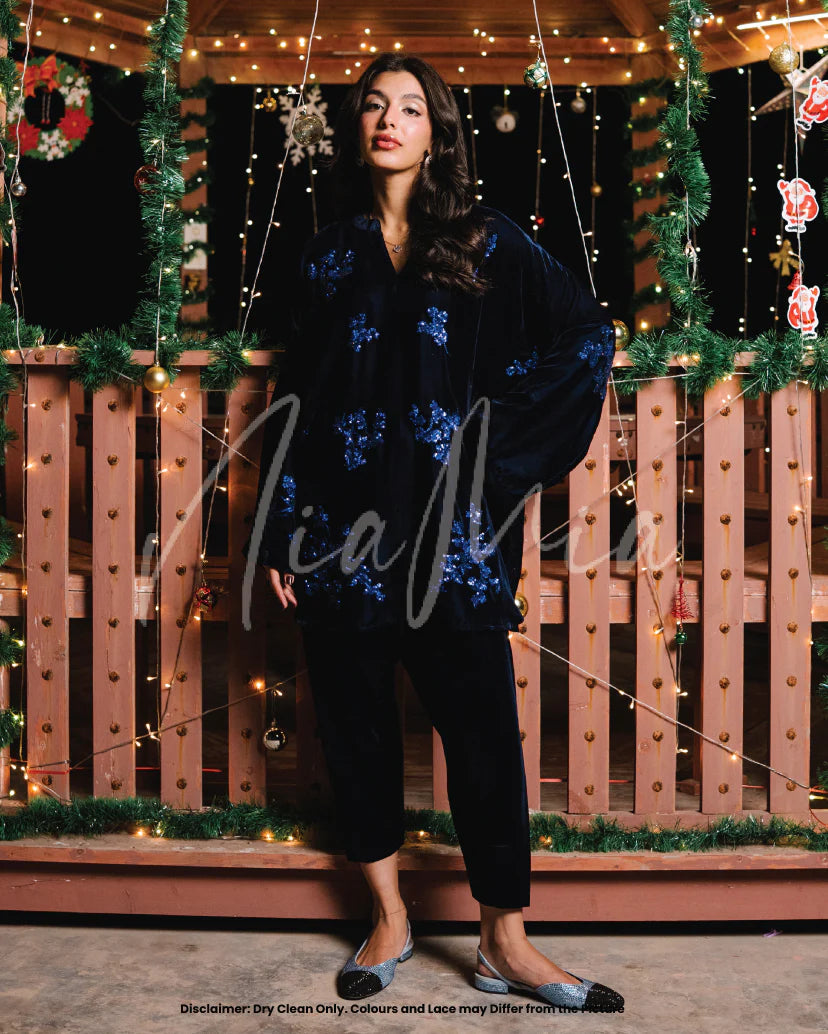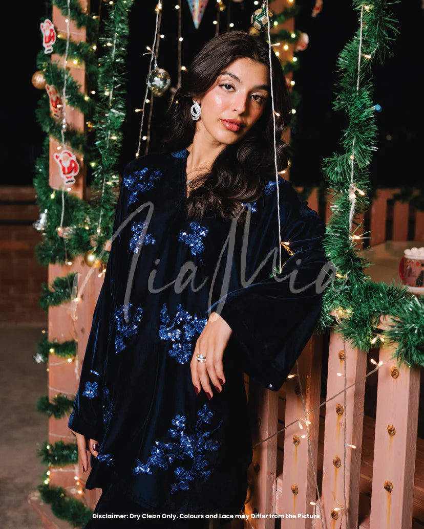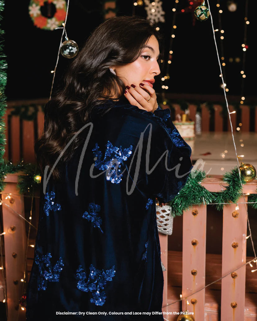 A deep midnight-blue velvet set embellished with shimmering blue sequined florals. Paired with a soft velvet shalwar, Glacier offers a luminous, winter-ready elegance perfect for evening wear.