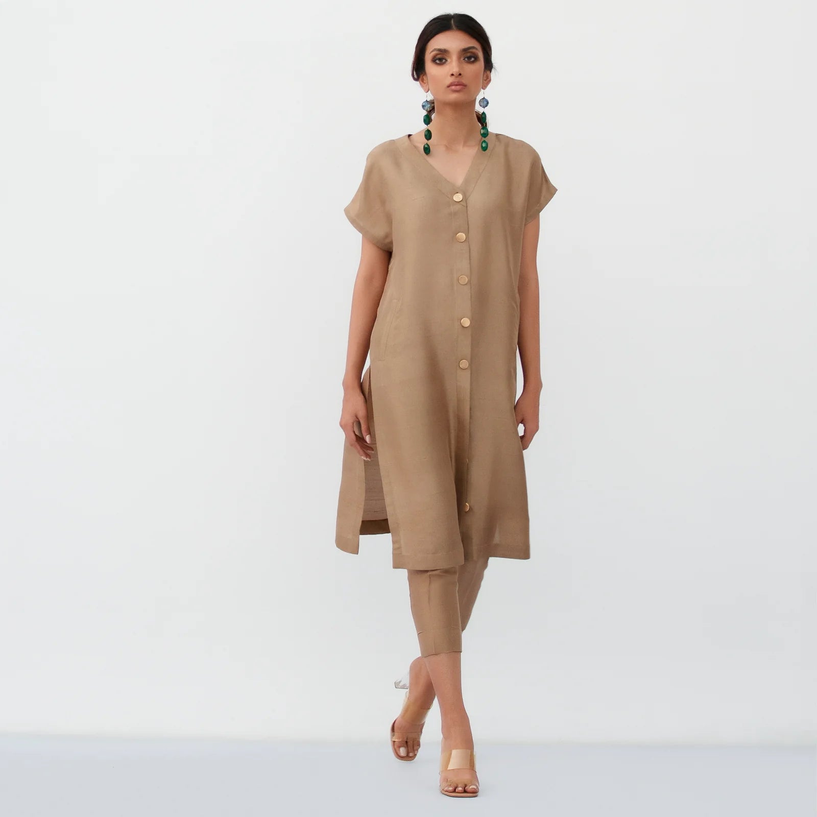 A gold raw silk ensemble featuring a structured shirt with fine gold accents, paired with crisp capri trousers for a modern finish. The organza dupatta, available separately, offers an optional layer of finesse.