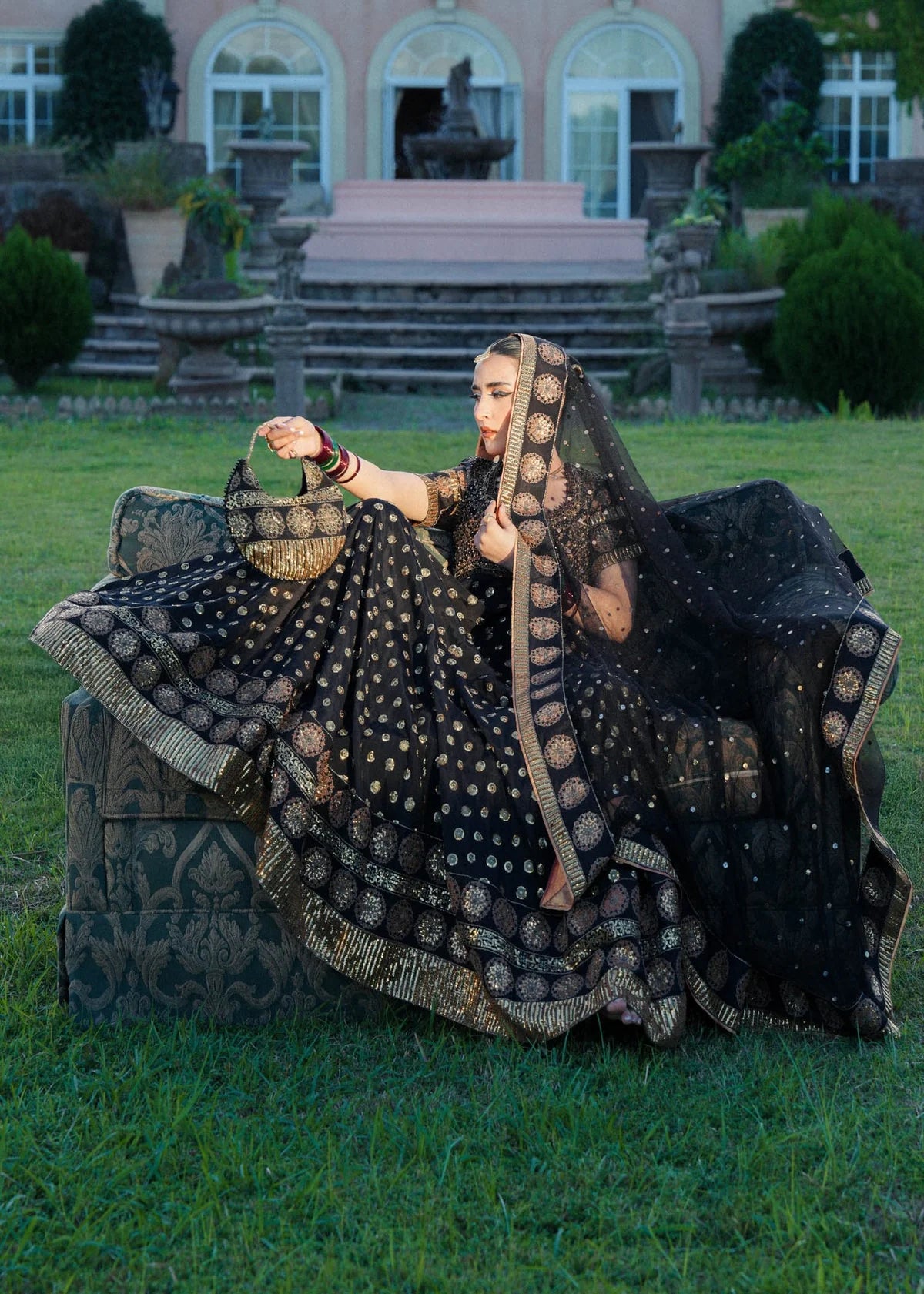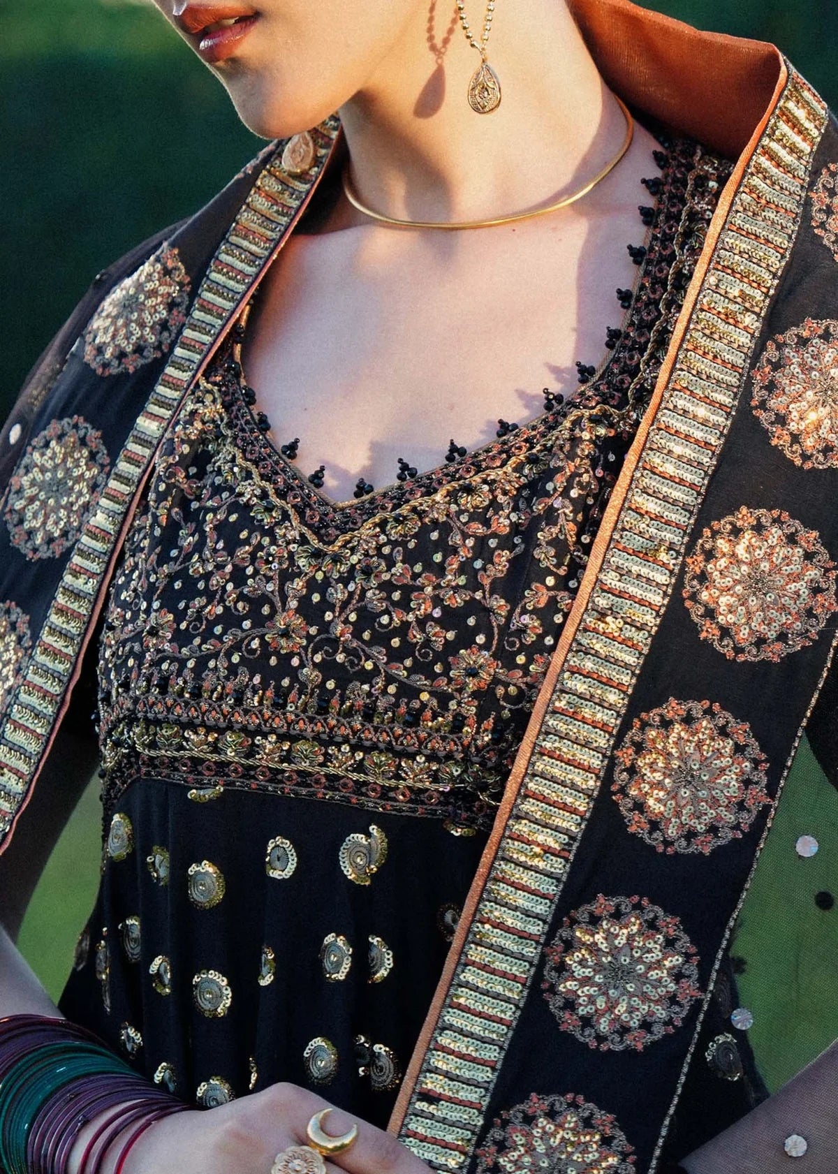 A captivating black ensemble that exudes timeless grandeur. This pishwas is adorned with intricate golden Mukesh handwork along the borders, with sequins and antique motifs flowing into a voluminous flare scattered with gold accents. A keyhole back with beaded tassels adds a modern, regal touch. The short embroidered sleeves and the hemline with metallic fringes enhance its drama, while the sheer dupatta, finished with bold handwork motifs and a detailed border, completes the look.
