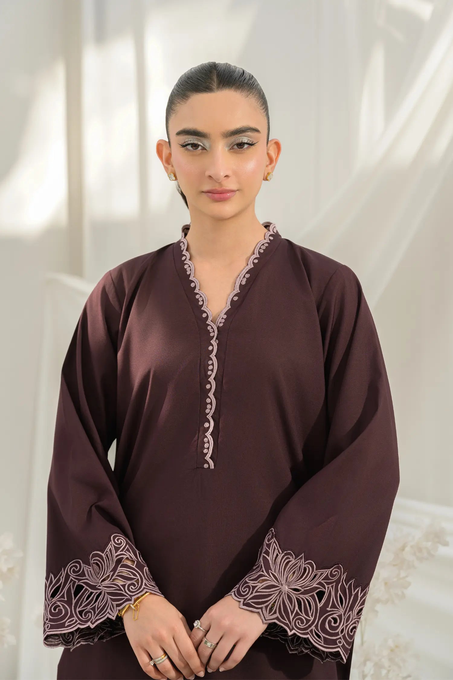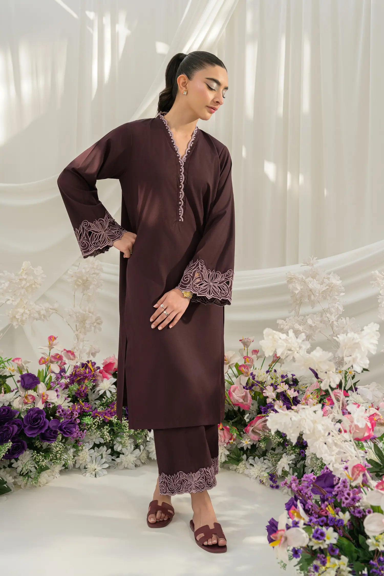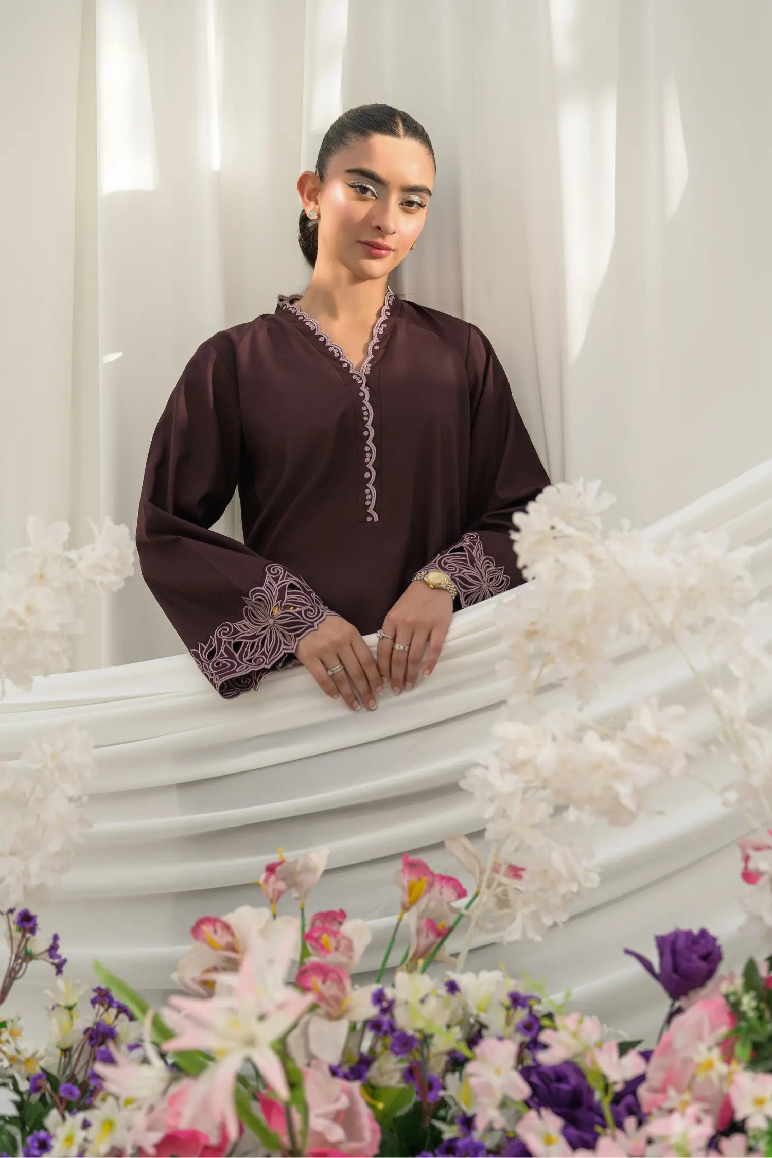 Plum coloured embroidered set that comes with long shirt and culottes. Fabric used is a premium blended viscose suitable for all seasons. Dupatta is brought separately and is curated from silk.
