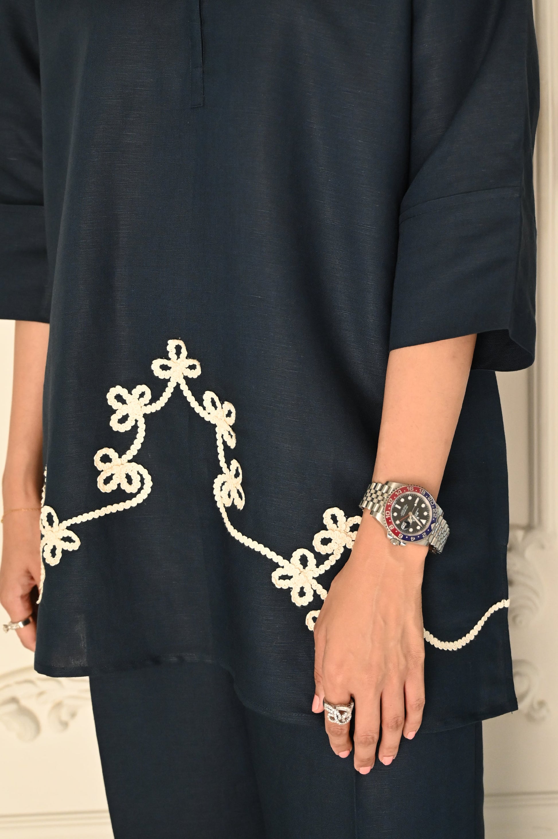 A Navy co-ord set, featuring a straight kurta with wide sleeves, accentuated with delicate beige floral bail embroidery along the hem. The kurta is designed with a collared neckline and a subtle V-slit. Paired with straight trousers, this ensemble reflects graceful minimalism with a touch of artistic detail.