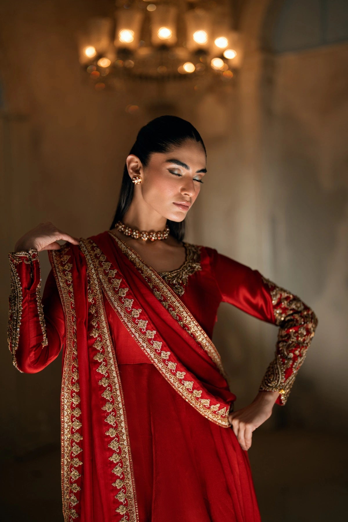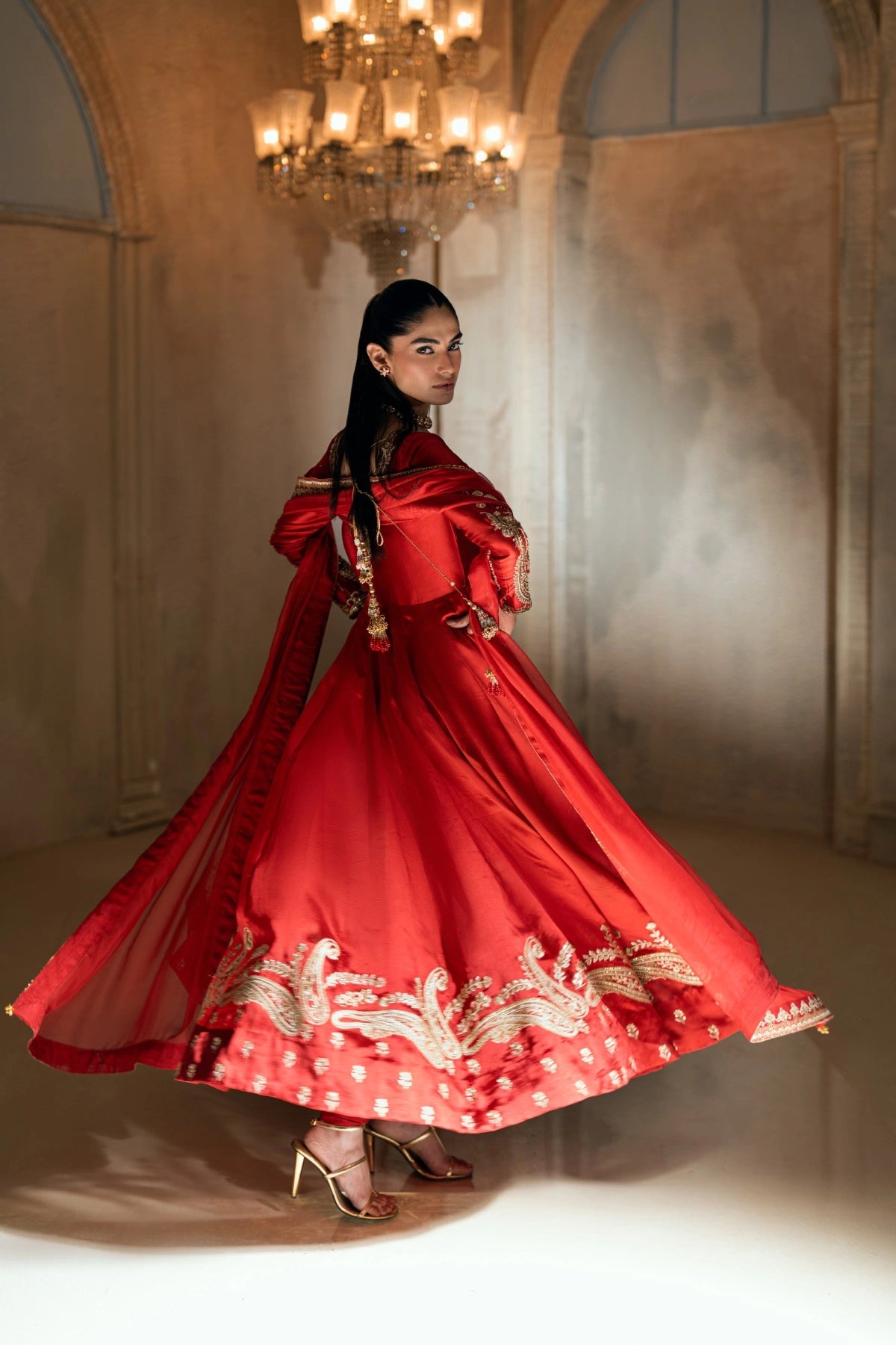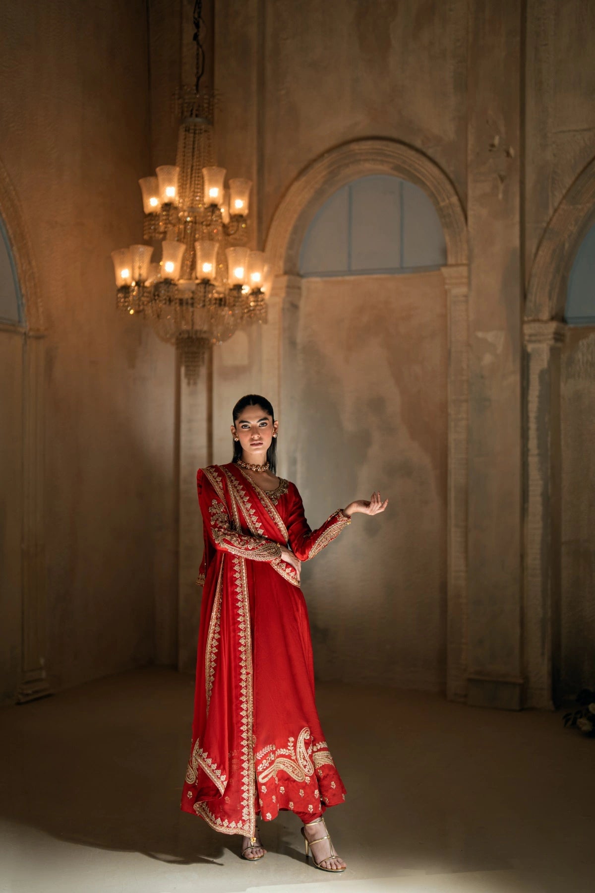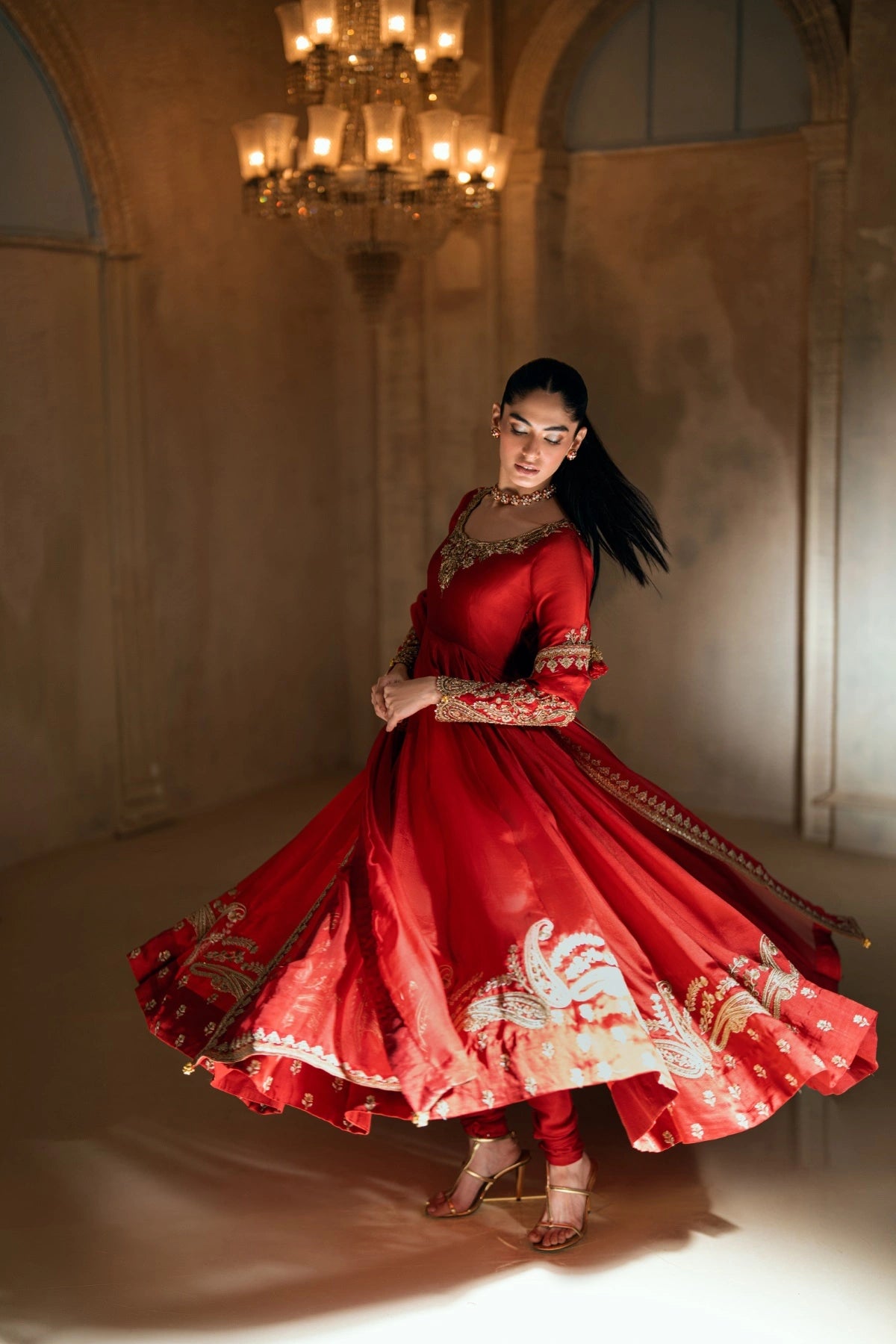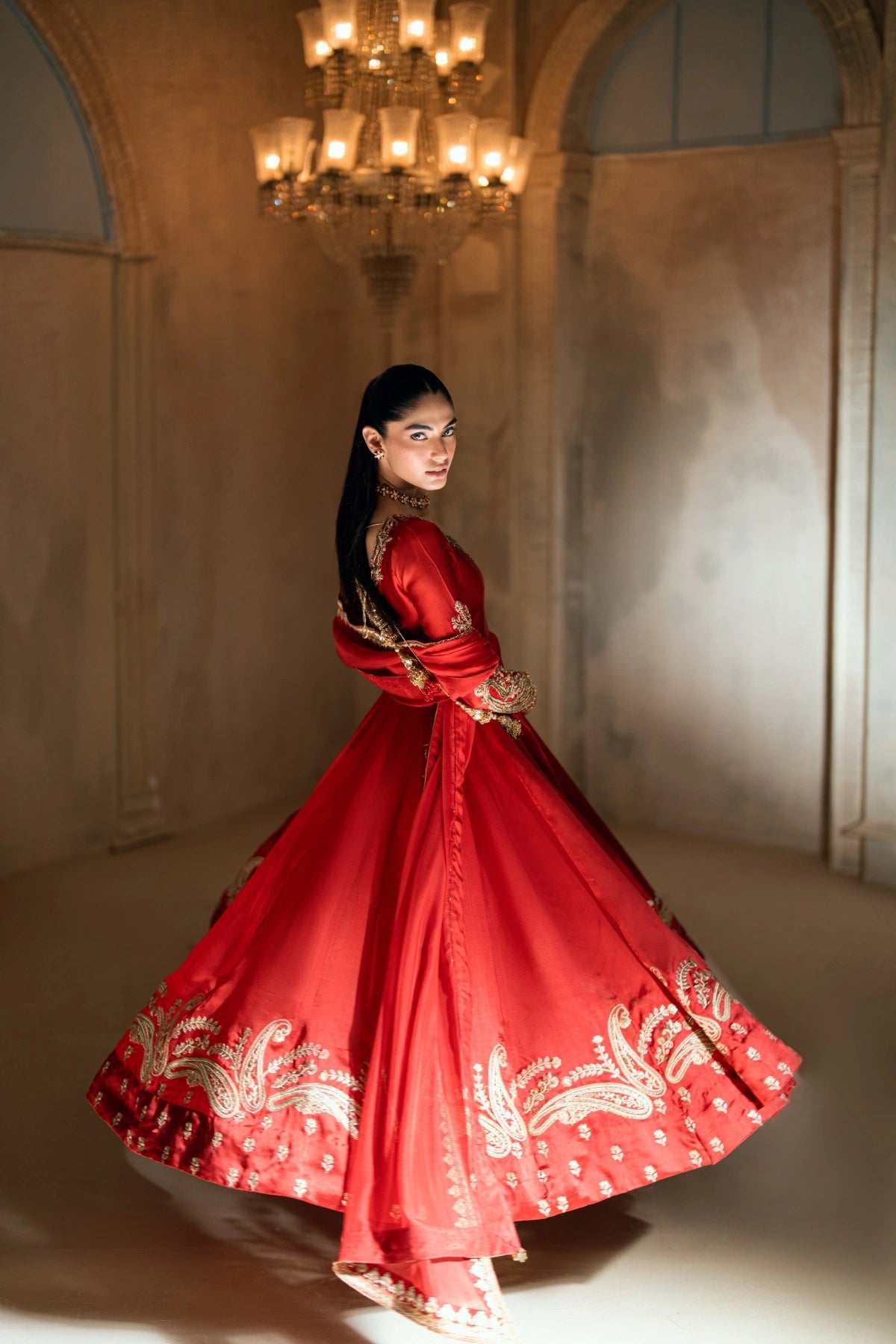 Masterfully tailored from premium sheesha silk, this breathtaking red peshwas features a dramatic 24-panel silhouette that flows with regal grace. The flared hem is enriched with intricate gold embroidery, creating depth and movement with every step. Meticulous handwork of kora, dabka, and stones adorns the neckline and sleeves, catching the light with a refined brilliance, while delicate ghungroo accents add a traditional rhythm to the design.